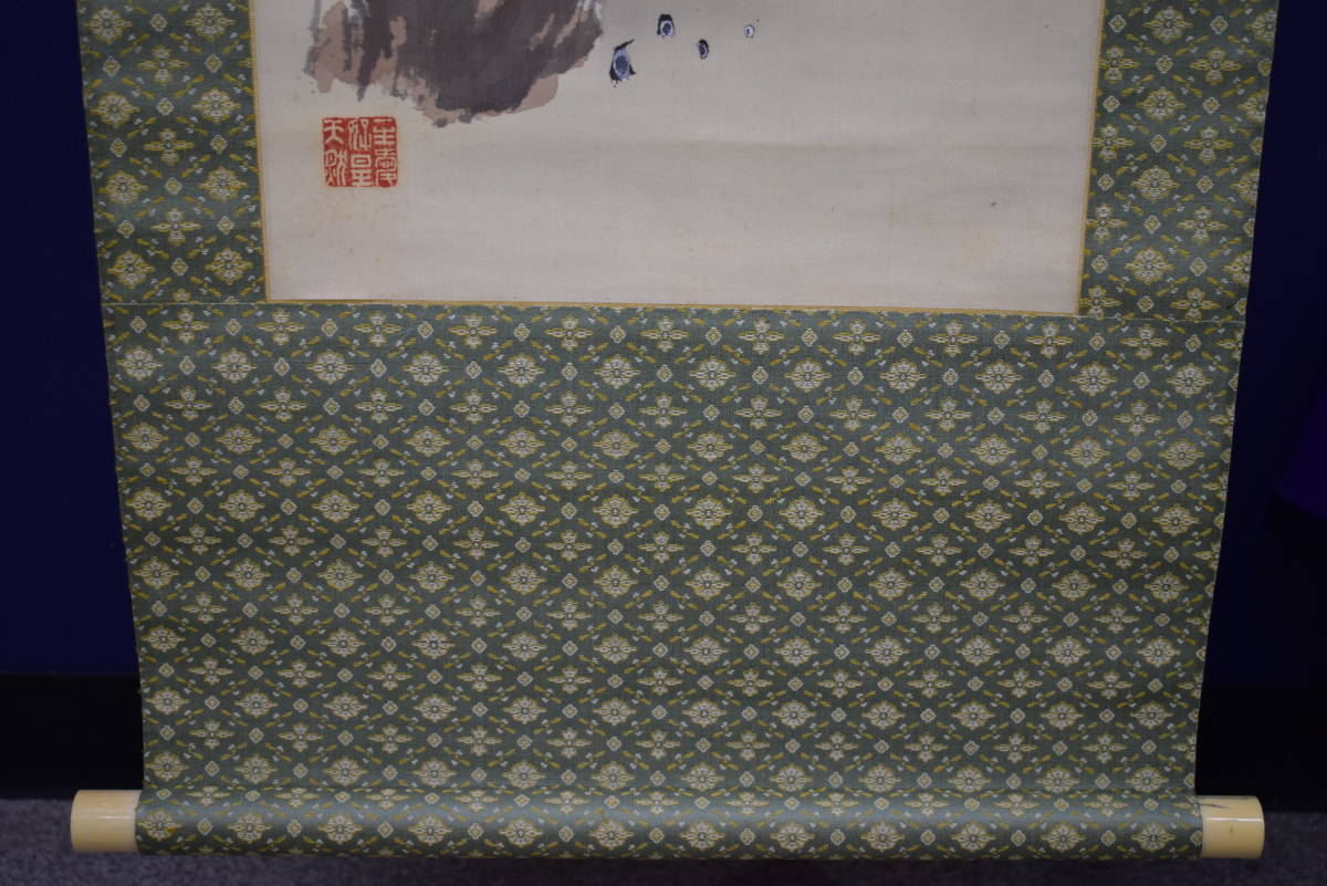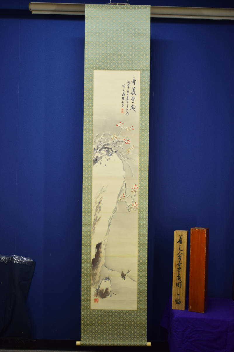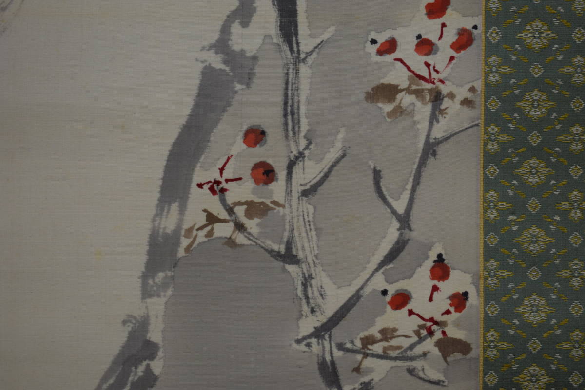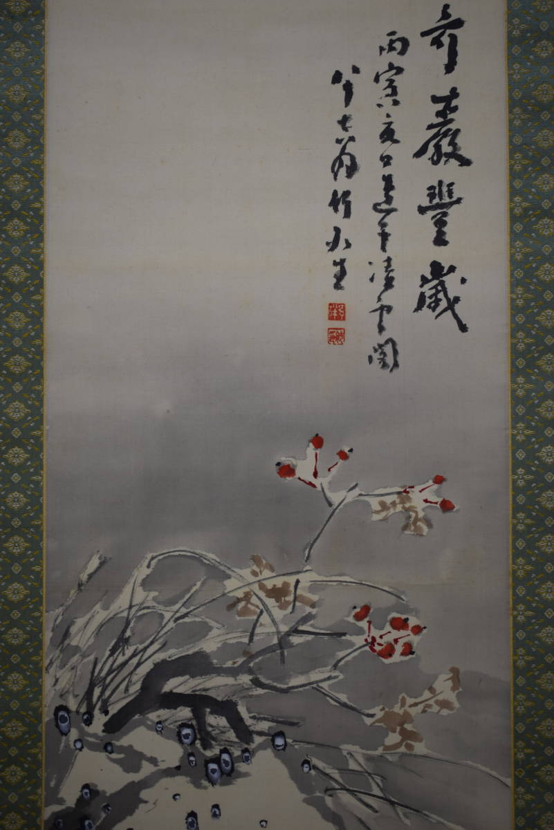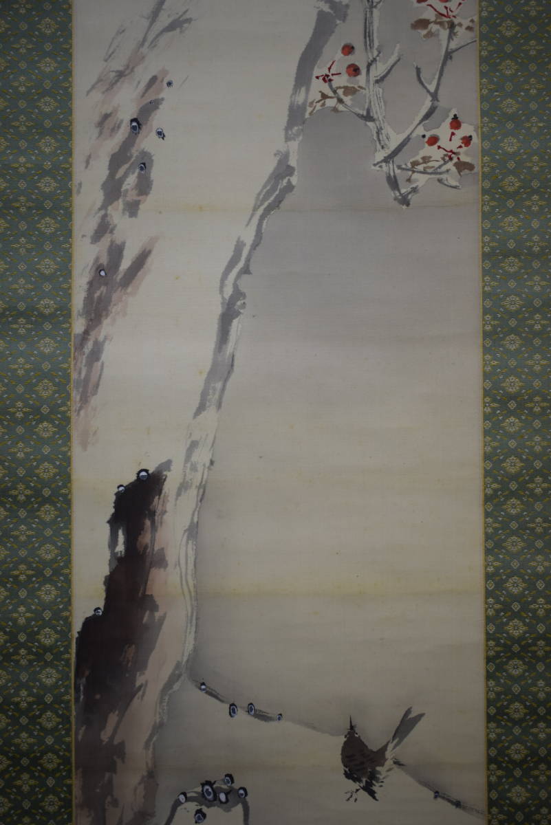 【真作】//姫島竹外/禽喜豊歳/雪渓花鳥図/絹表装/桐共箱二重箱付/布袋屋掛軸HH-969