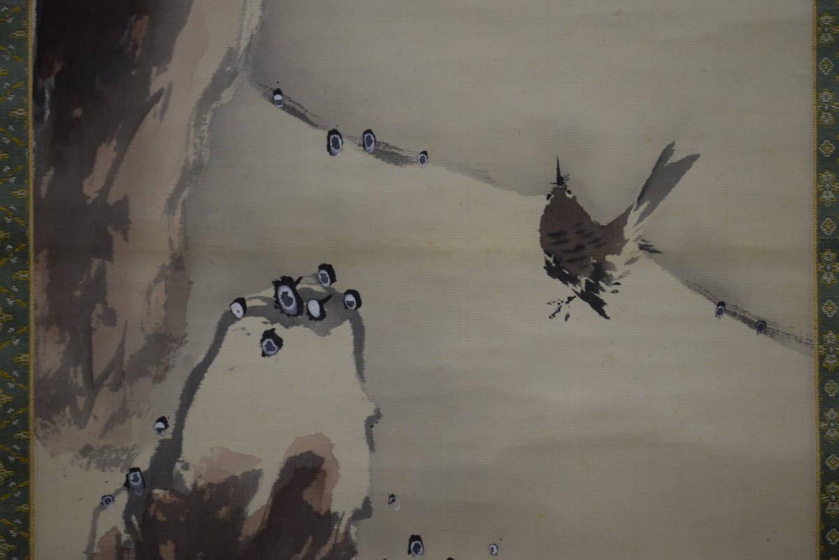 【真作】//姫島竹外/禽喜豊歳/雪渓花鳥図/絹表装/桐共箱二重箱付/