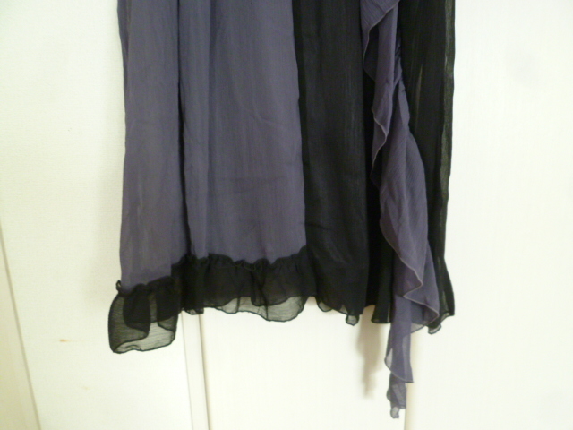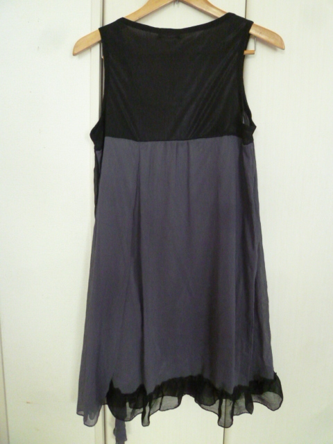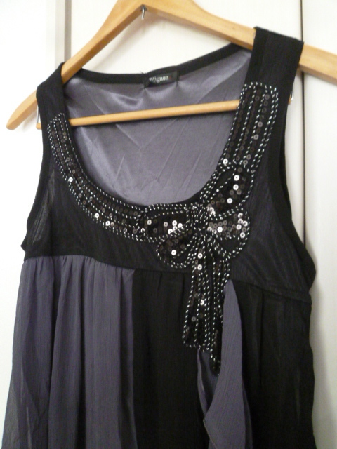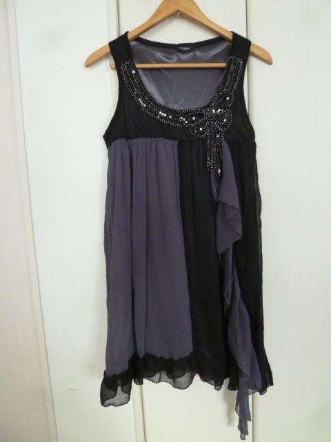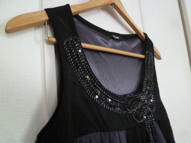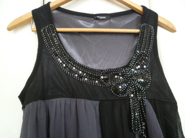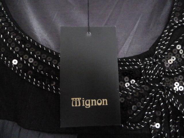 【新品】mignon△スパンコールデザインリボンシフォンワンピースM/アシンメトリー黒×グレーバイカラーフォーマル結婚式にも△OP122
