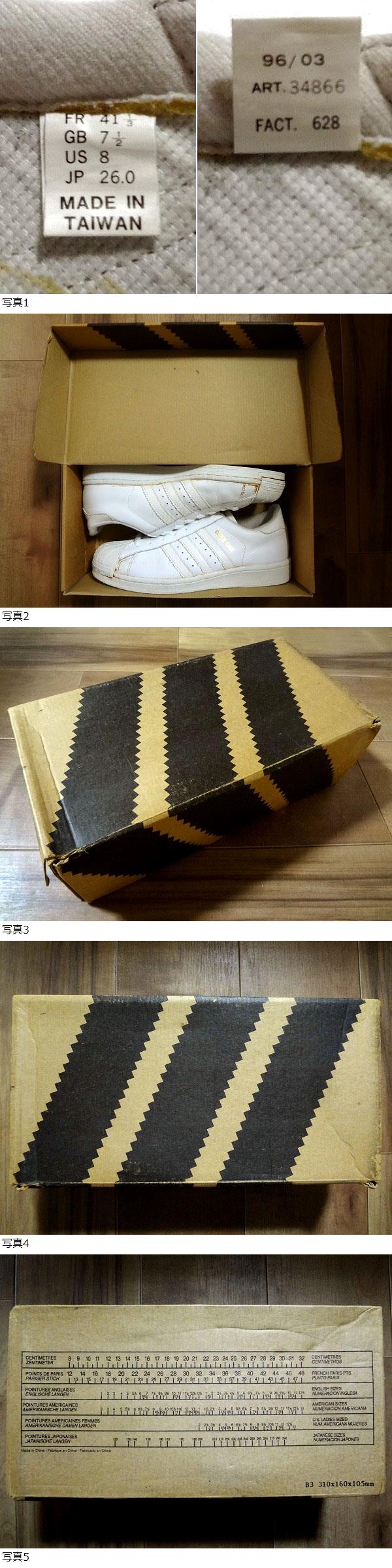 箱付き良品、ビンテージ、レア! ADIDAS アディダス SUPERSTAR スーパースター ホワイト 1996年台湾製 26cm US8 オリジナル フランス 金ベロ
