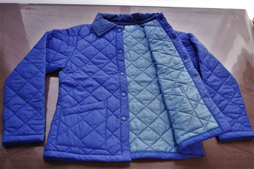メイドインイングランド(表記あり)、前開仕様(スナップボタン)、素材はナイロン100%、中綿ポリエステル100%、表記サイズ36(Mサイズ相当)、平置きの素人採寸ですが着丈約57cm、身幅約43cm、肩幅約35cm、袖丈約54cm、タグ付き未着用、購入時の定価(2万1600円 表示あり)、購入後はビニール袋に入れた状態で大切に保管しています。