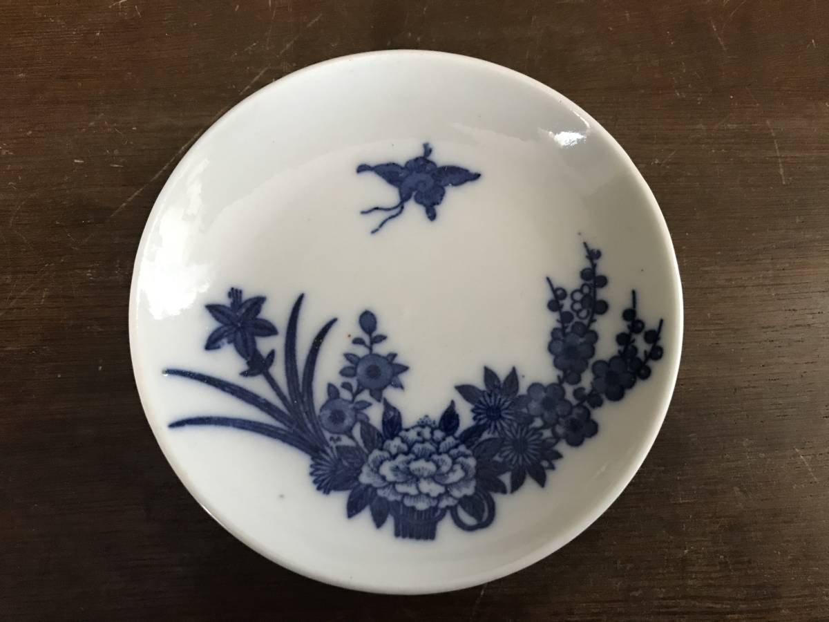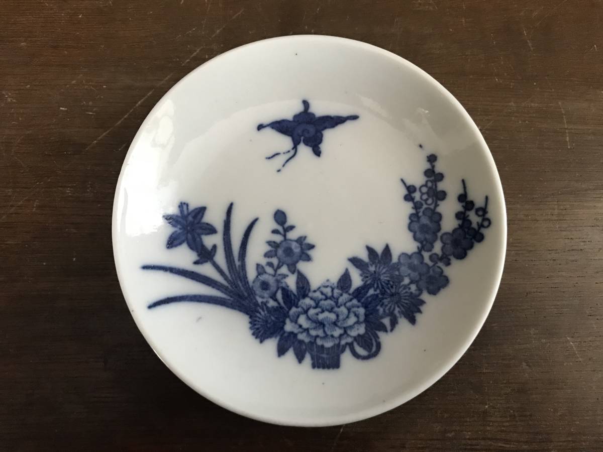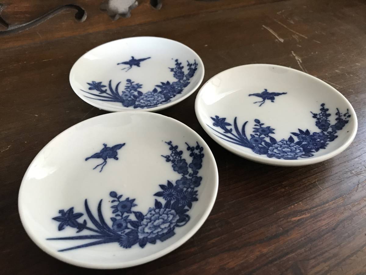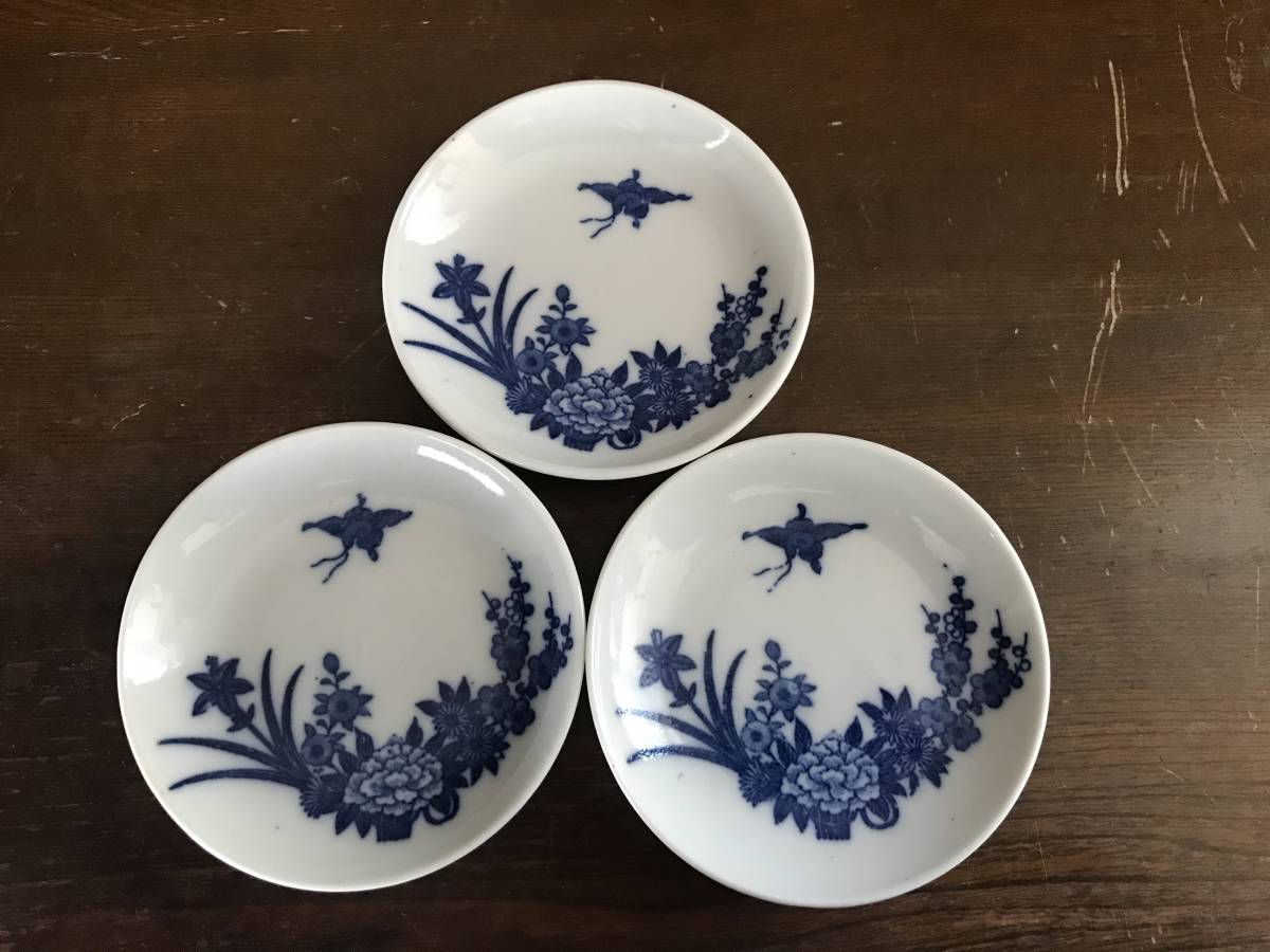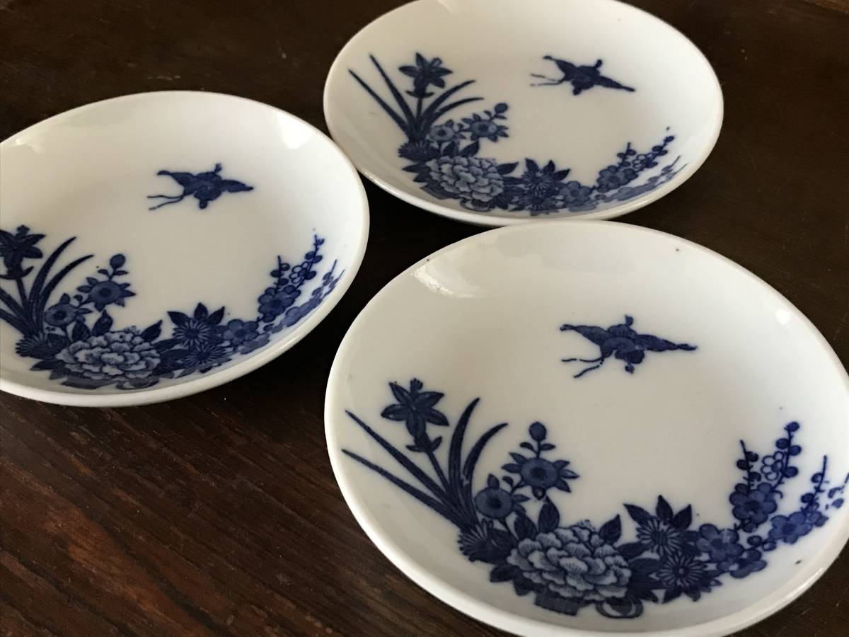 印判皿 アンティーク 明治~昭和初期 小皿 花 牡丹 菖蒲 菊 梅 鳥 藍色 3皿セット