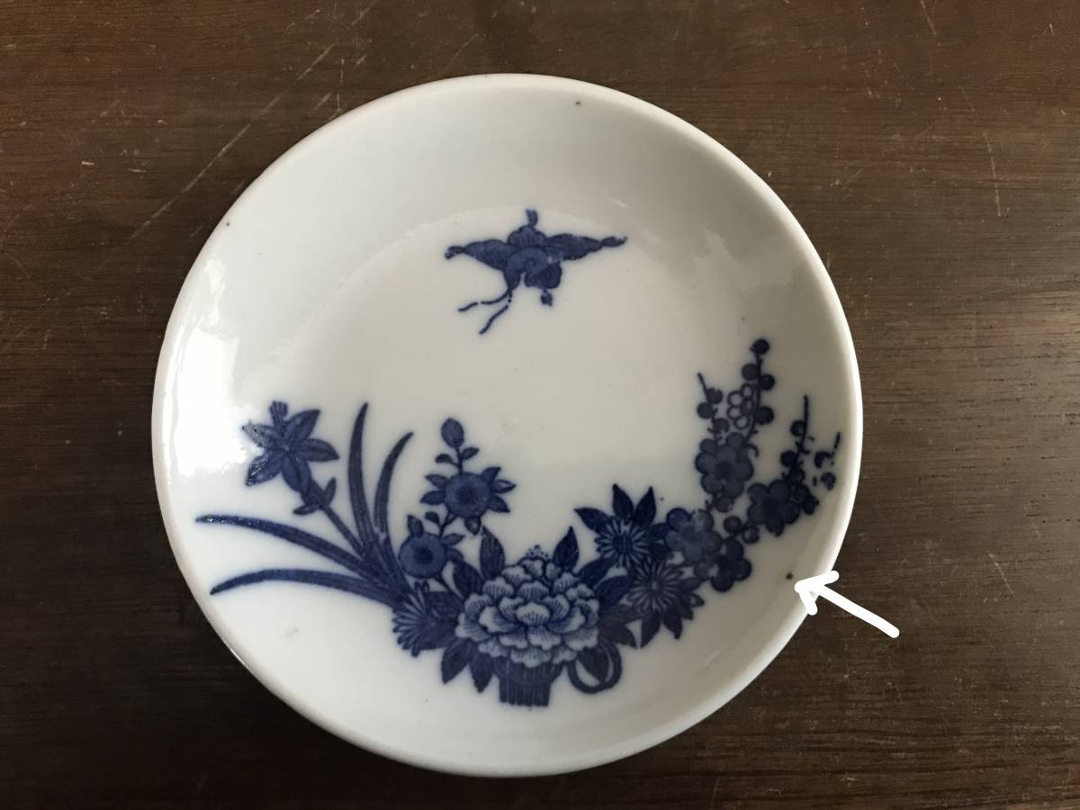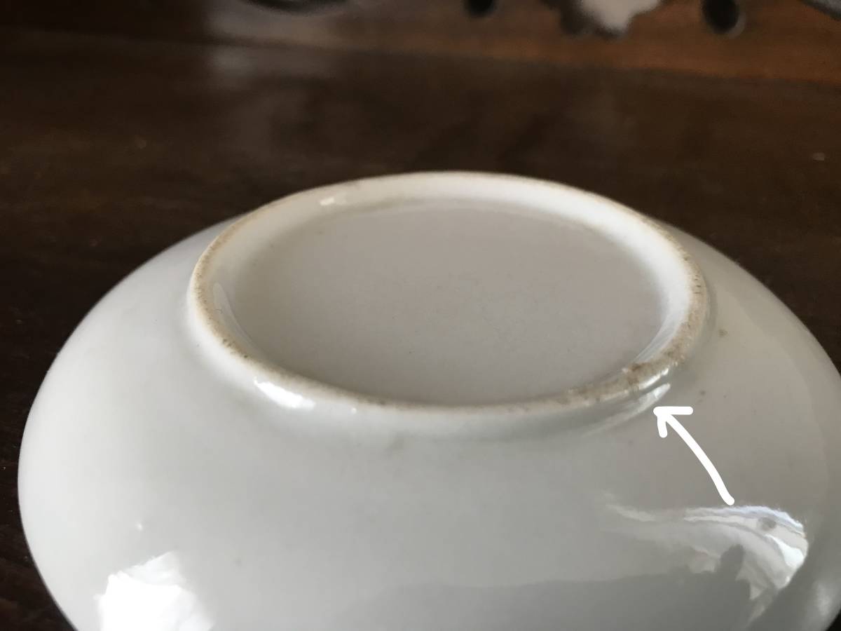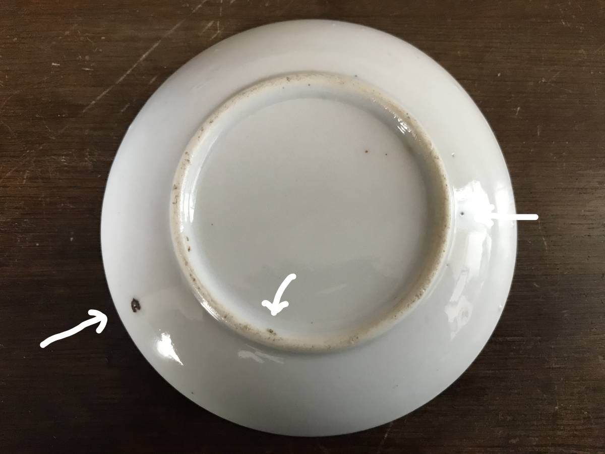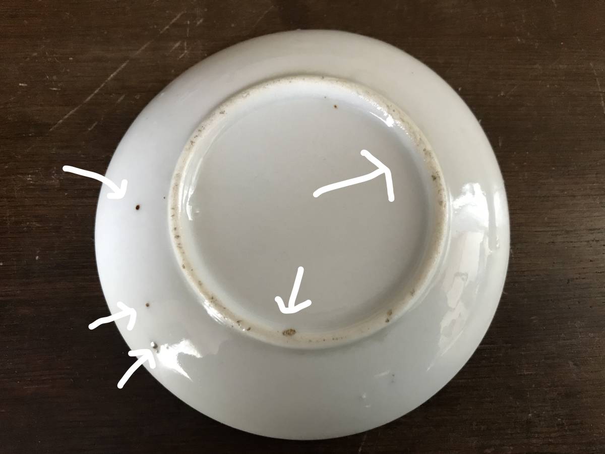 印判印刷のズレ、染色や釉薬のムラ、スレ、高台のカケ、ザラつき、キズ、焼灰など(画像2、4~6番目)が