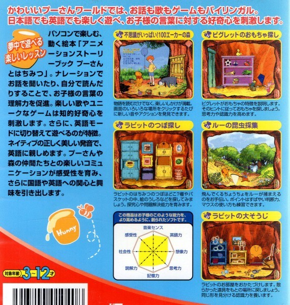 物語には、クリックで動く楽しい仕掛けや学習ゲーム、歌を収録し、子供の学習意欲と好奇心を育てます。