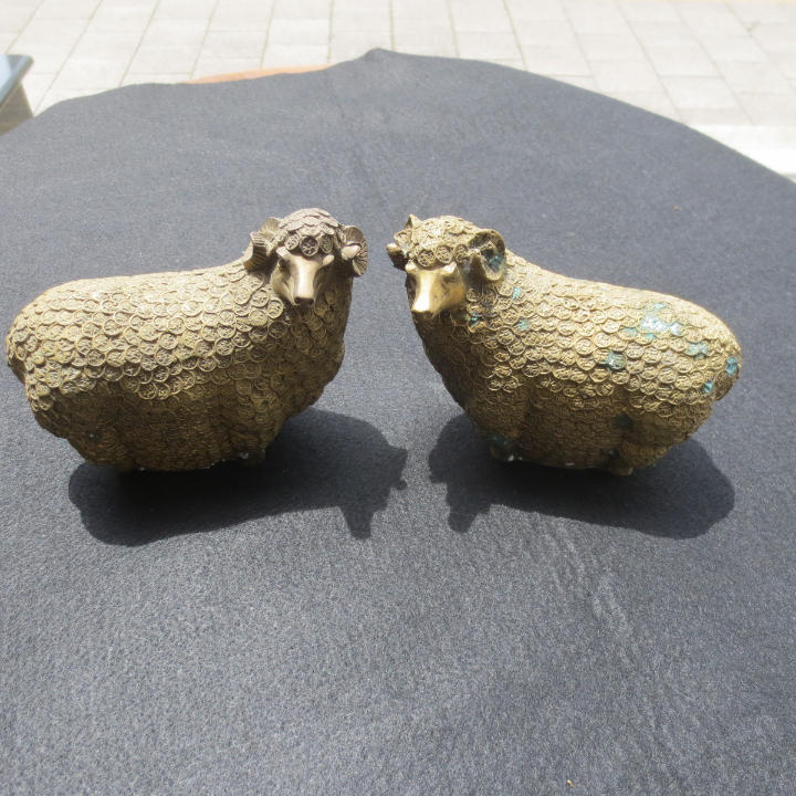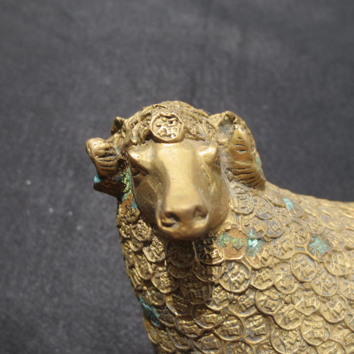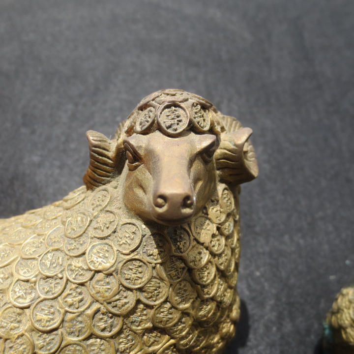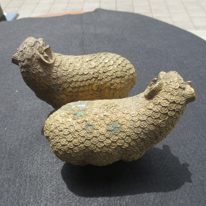 お金の羊  お金の台座がある 全体で銅銭 縁起物 金運アップ 巻羊の角 新年の祝い 開運 置物 銅製の羊 一対です 骨董品です 体調 :約13cm 胴幅: 約6cm 体高:約11cm 体重:約900g/体(1.7kg/2体) 備考:固いところに置くとガタツキが出ますので布などを敷かれることをご推奨します。 完璧な工芸、良い材料、彫像を飾り 高級感を醸し出しています。 家や仕事場に置くと、財がやってくるという事で、金運・財運パワーを引き寄せる力があるとされています。 仕事上の良い運気や人脈を招くといわれ、主にビジネスや商売の場で扱われる縁起物として人気のアイテムです。 中国湖南省の骨董市で購入したものです 金アップにいかがでしょうか。