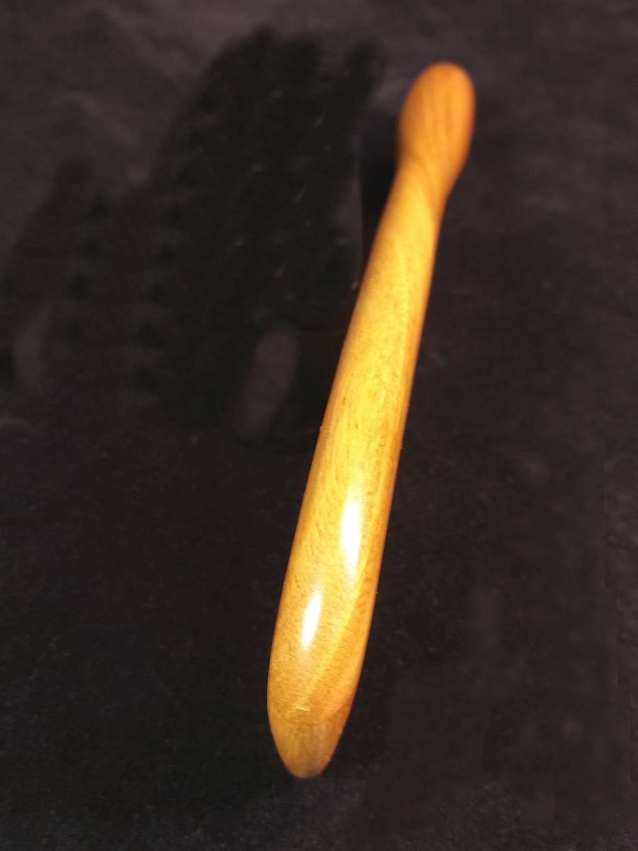 現在出品に使用の黄金黄檀木の特徴は:①油性が、非常に良質で、②密度が最も高く、③色合いが、最極上の金黄茶色です。④重厚感が充分あります。⑤木紋紋理は、非常に綺麗です。⑥香りは、濃厚で、非常に趣があります。
