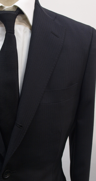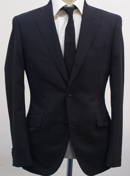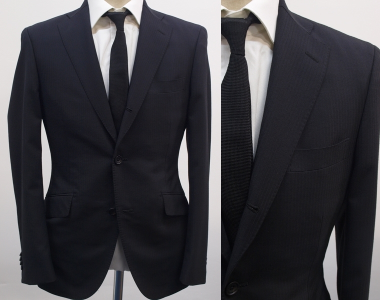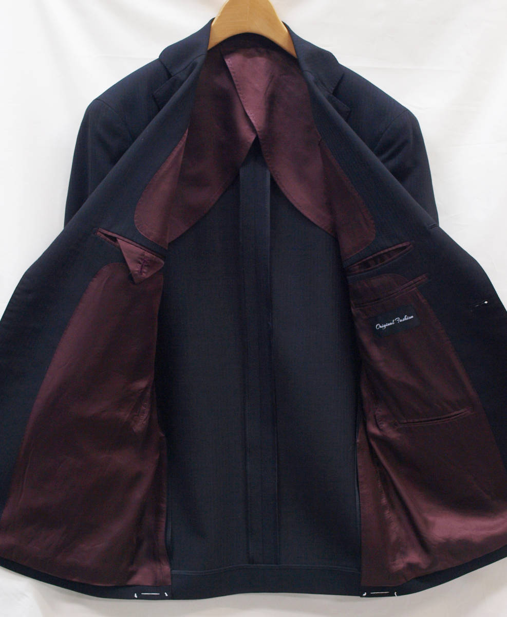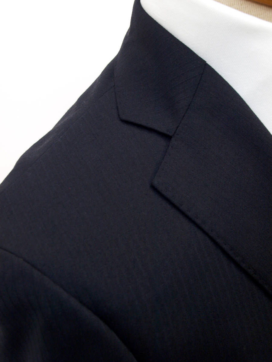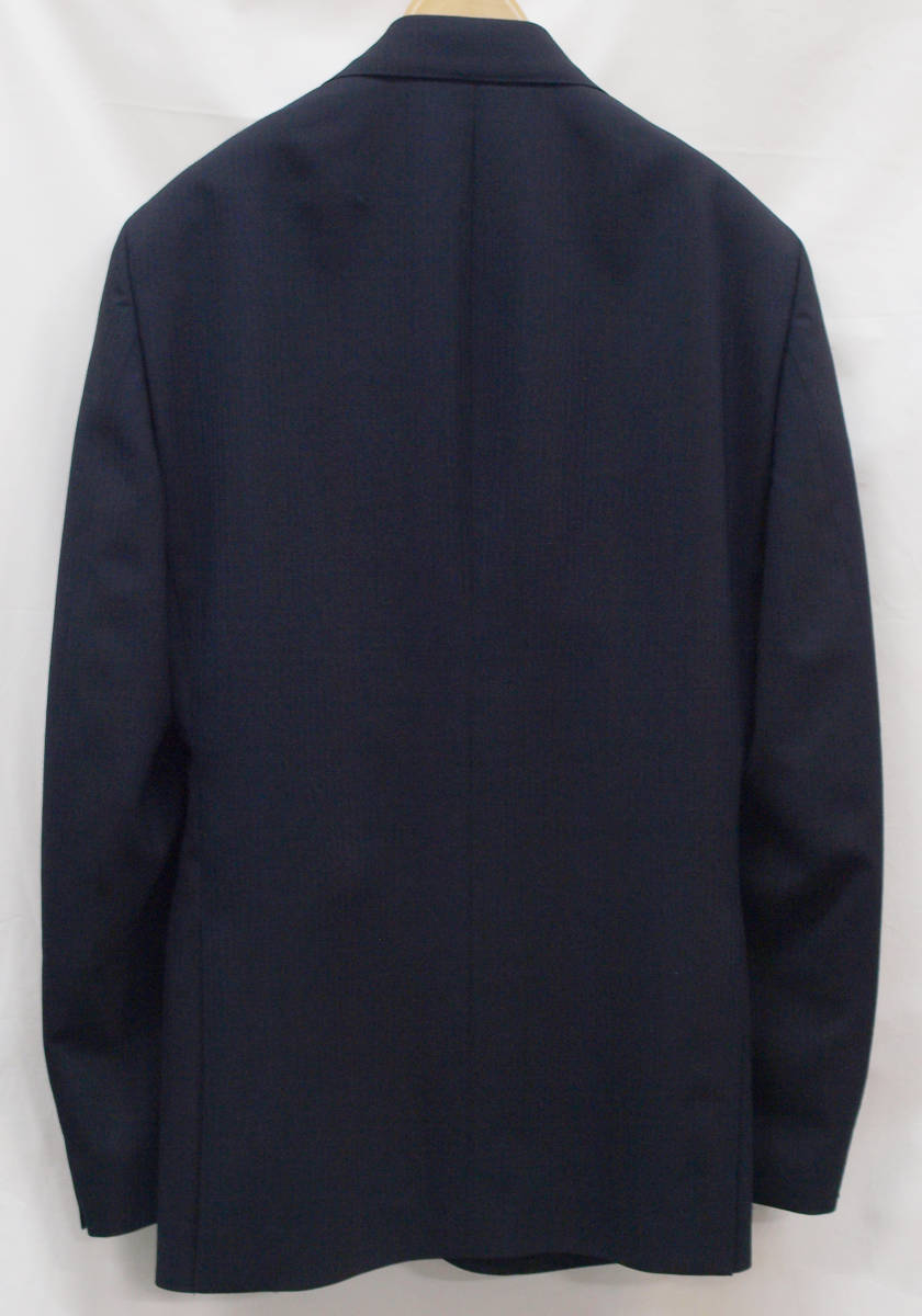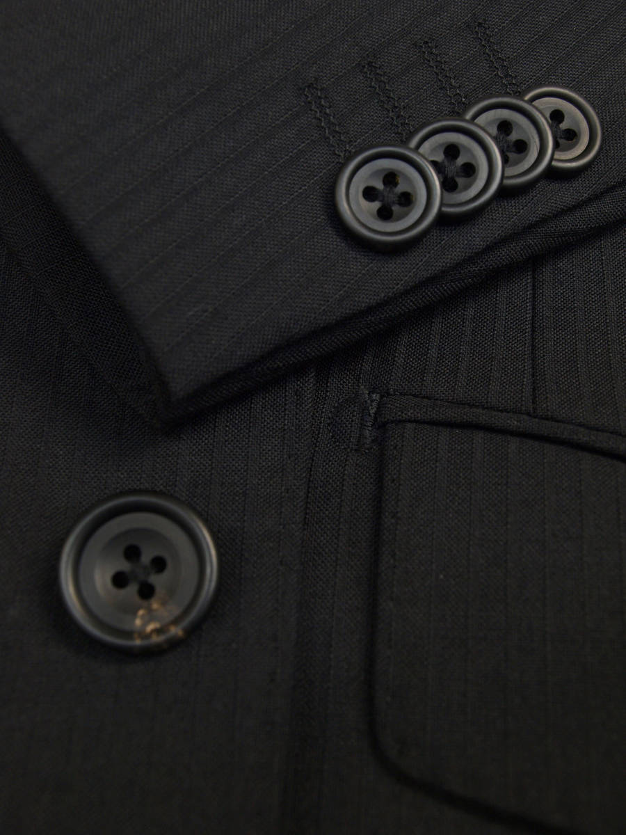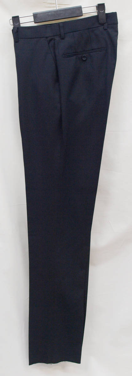【サイズ】 Y6(YL号サイズ相当) 目安の体型 身長170cm~180cm、ウエストサイズ78cm前後 【ジャケット実寸】 肩幅44cm 着丈72.5cm 袖丈62.5cm 脇下部分47cm 身幅42cm 【パンツ実寸】 ウエスト(胴回り実寸)78cm (平置きでかるくはかると78cmでひっぱってはかると80cmです。股上がやや浅いため2cmほど実寸が大きくなります。) わたり幅31cm(股下10cmの部位で28.5cm) 裾幅19cm 脇股上21cm 前股上23.5cm 股下90cm(裾上げしていない状態/新品) 【素材】 表地:ウール30% ポリエステル70% 裏地:胴裏/ポリエステル100% 袖裏/ポリエステル100% やや薄手でさらっとした紳士スーツ向け春夏用ウールブレンド素材を使用 【色】 黒色 【柄】 コードストライプ織柄入り 【デザイン】 コンパクトな印象の細身ですっきりとしたシルエット、タイトフィットスリム、ビジネススーツ新品、裾上げしていない状態です。 ・ジャケットは一番上のボタンはかけずに着用する段返りシングル3つボタンのスリムフィットスーツ ・パンツの股上はやや浅めで細いシルエットのノータックスリムパンツ 春先~夏~秋にかけて春夏メインのシーズン対応商品 【縫製仕様】 ・ジャケットは段返りシングル3つボタン、ノッチドラペル、襟縁等AMFステッチ入り、袖口ボタン4つ、サイドベンツ、内ポケット4つ(小ポケット2つ含む)、背抜き(春夏物) ・パンツはノータック、膝裏当て付き、脇ポケット斜め付け、後ろポケット両玉縁で左のみボタン付き、フロントはファスナーでボタン&ホック仕様/うちかけボタンあり きちんとしたビジネススーツの仕様で仕上がっております。