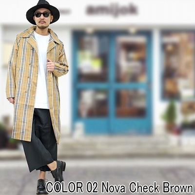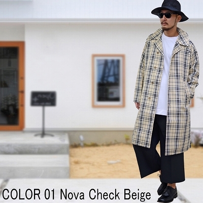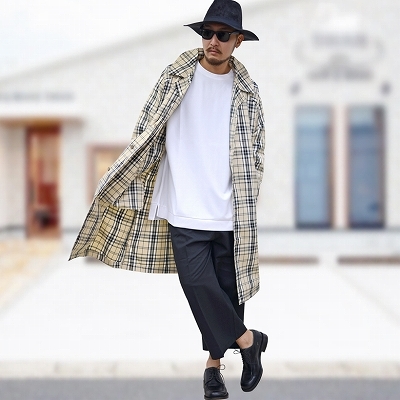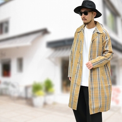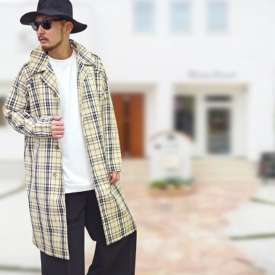軽やかな質感のチェック柄ゆったり系ステンカラーコート ショップコート。