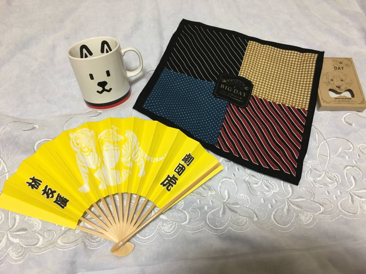 とてもカッコいい、劇団 虎 林友廣 似顔絵入扇子(幅約32丈20cm)&お父さん犬マグカップ(本体:径約8×9cm)&BIG DAY綿100%ハンカチ約24cm角、未使用ですが新品ではありませんので、詳細はご了承ください!