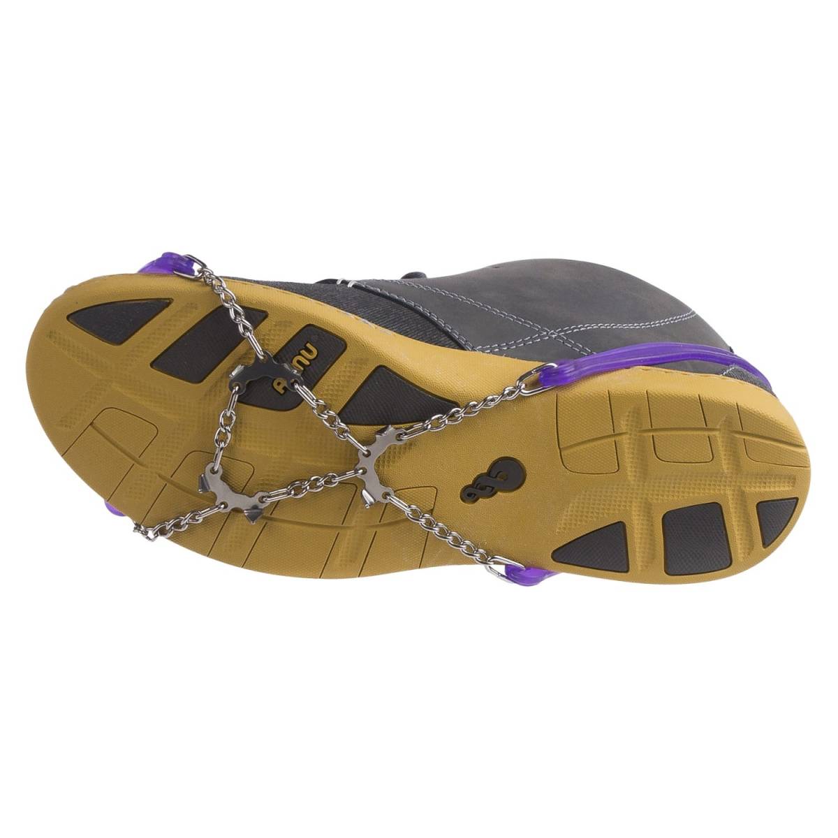 靴は普通のスニーカータイプのものであれば基本的に取り付け可能です。なお、ソール部分に金属製スパイク&チェーンを用いていますので、ソールにダメージがあることを懸念されるような靴には使用しないでください。