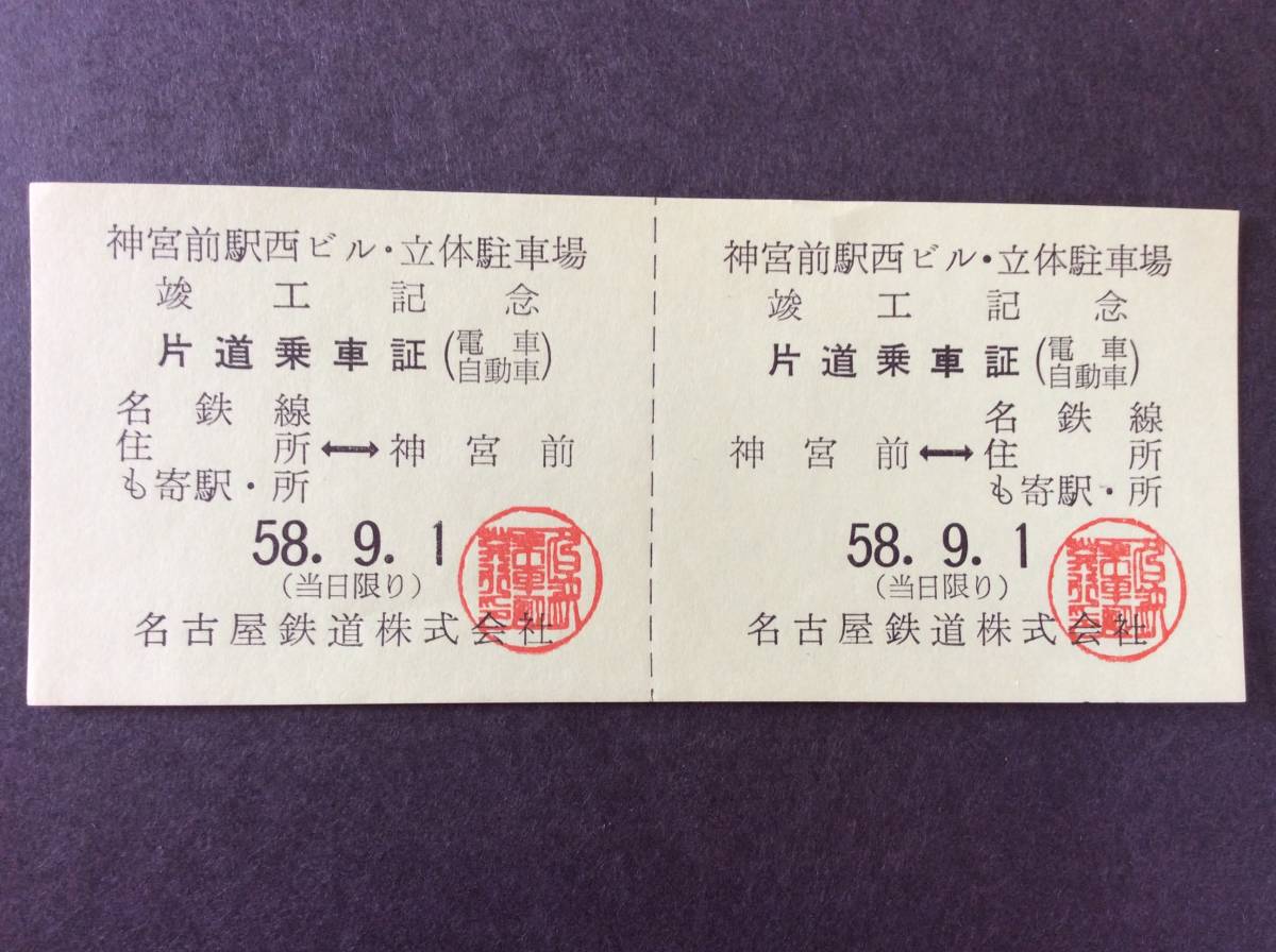 名鉄 神宮前駅西ビル立体駐車場竣工記念 片道乗車証 昭和58年 非売品