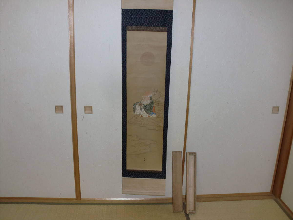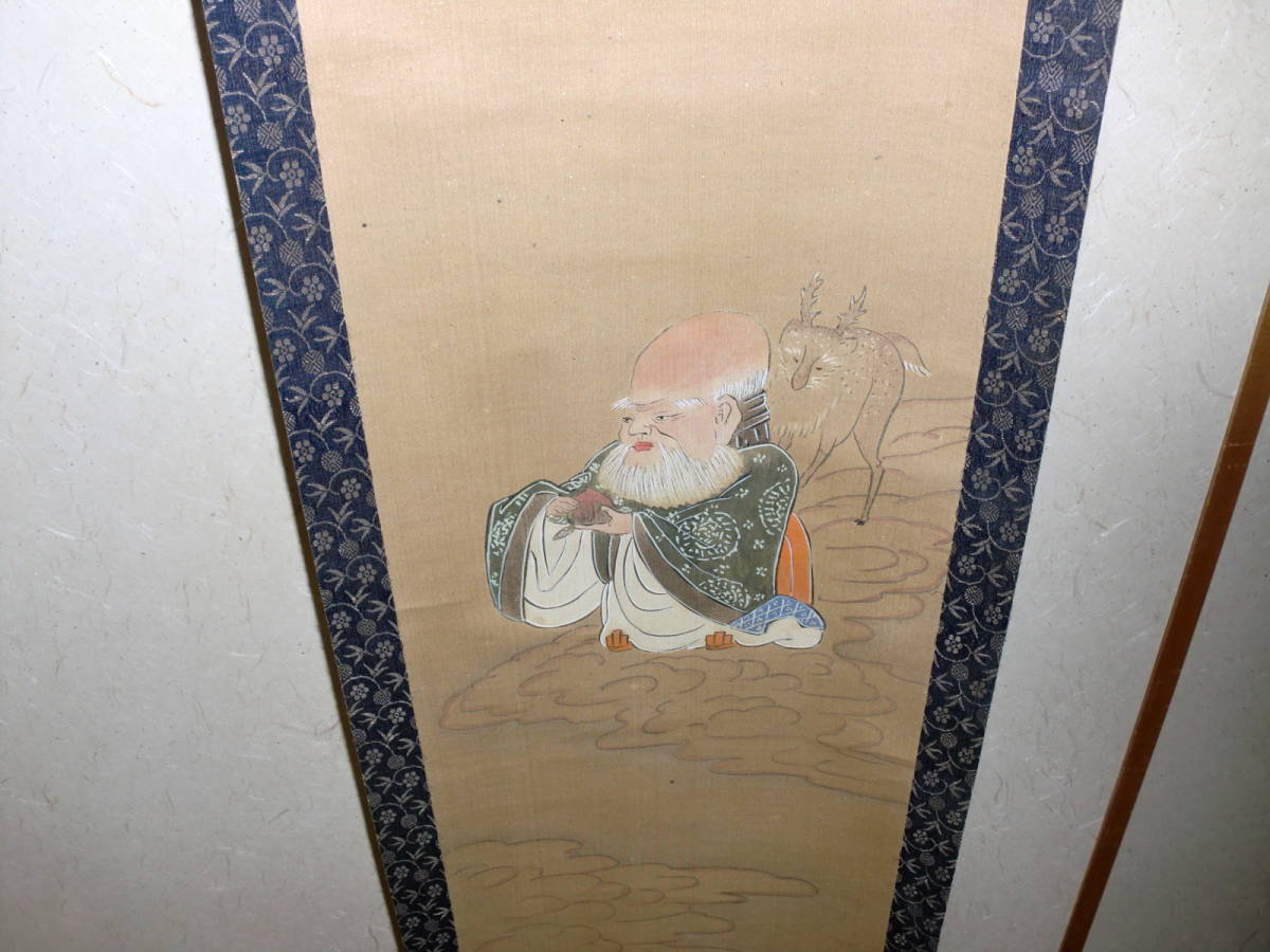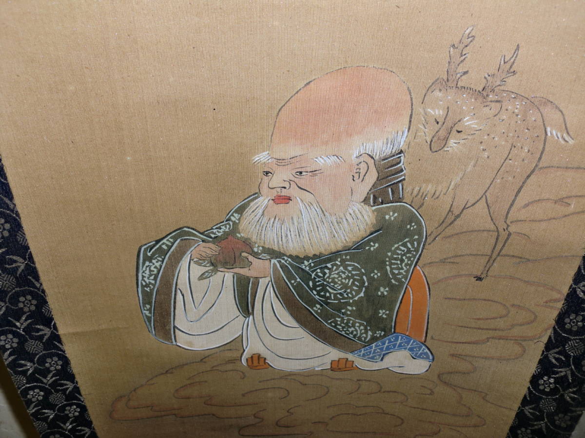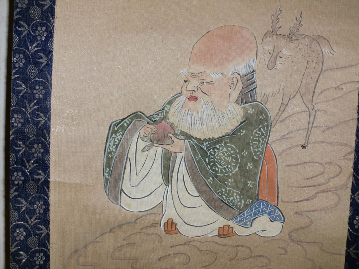 注 疫病撃退、長寿祈願に効力があるとされる 牡鹿を従え 桃を持った 彩色でトテモ綺麗で渋ーい寿老人之圖。