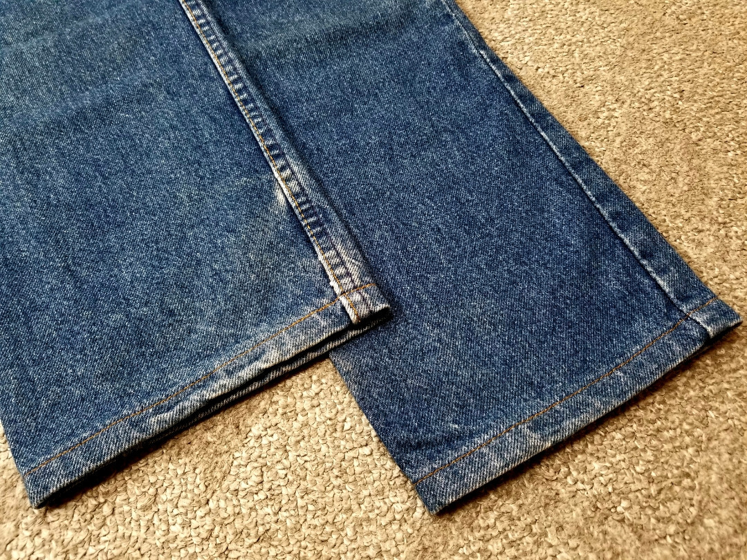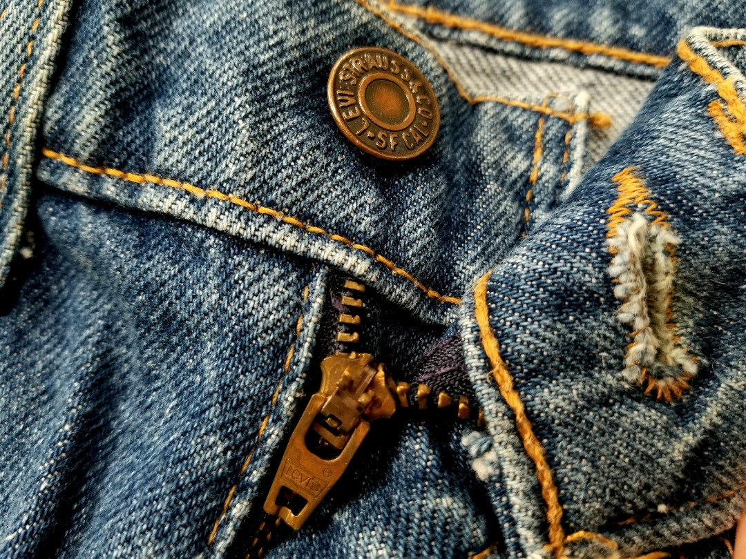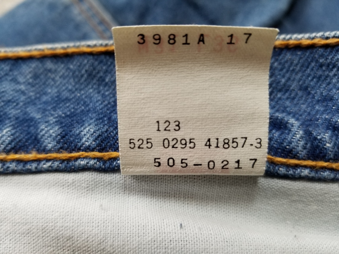 比較的濃い目の色残りの一着で、トップボタン裏525で脇方返しロック赤茶です、前開きファスナーはロゴ入りUSAYKKです、サイズ表記はw31です。