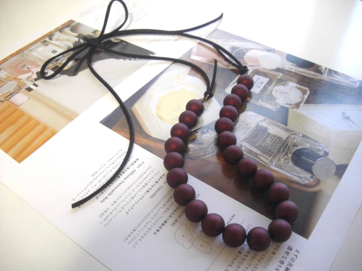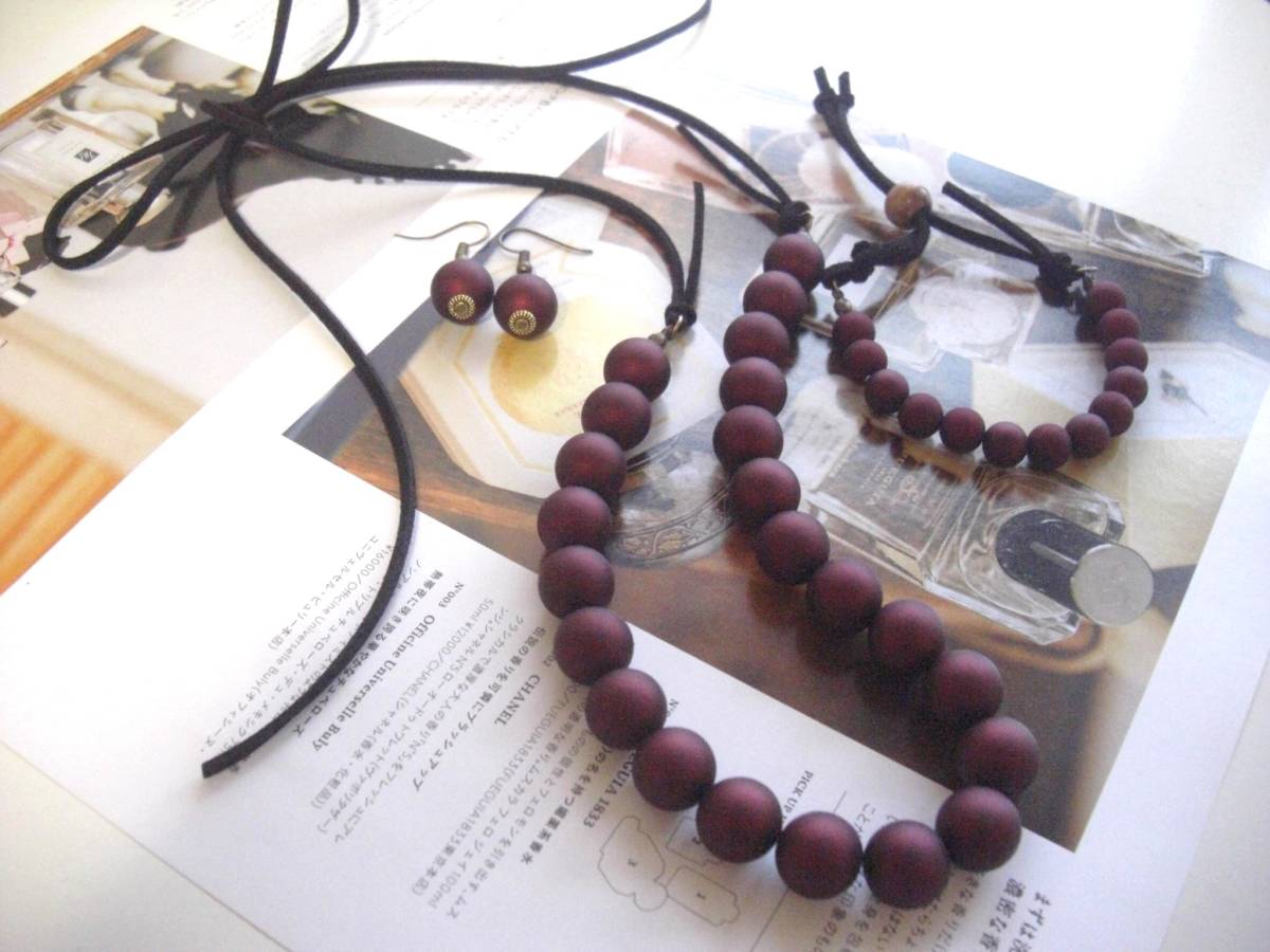 ハンサム・ガール・・シリーズです♪お気に入りの色使い・・シックなダークレッドの樹脂パールのネックレス、ブレスレット、ピアスの3点セットです♪マットな深い赤のパールに黒のスェード紐を合わせて甘すぎない大人のロマンチックしています♪ネックレスの樹脂パールは11ミリ位です♪長さは全長115センチ位です♪短く結んでチョーカー風にされても素敵です♪ブレスレットは8ミリの丸玉です♪長さは全長28 センチ位で調節自由です♪樹脂パールのピアスは11ミリの丸玉です♪長さは3・5センチ位です♪イヤリングにも 変更出来ます♪それぞれ単品やお色違いも出品しています♪ハンドメイドをご理解いただいてノークレーム・ノーリターンでお願いします♪