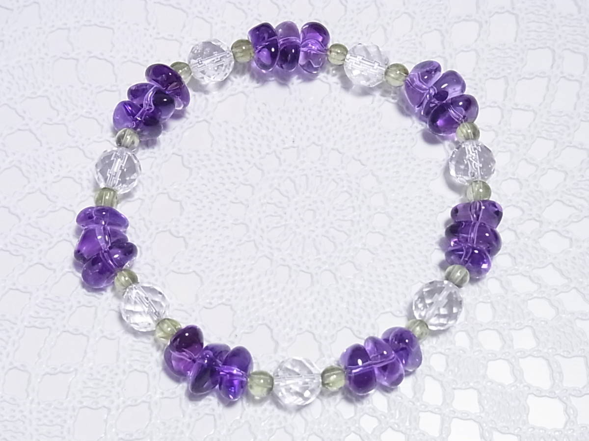 【数量限定販売になります】 一般的にビーズに使われるアメシストは、 クラックやインクルージョンが多い品質の石が使われていますが、このアメシストはビーズとしては非常にクリーンで高品質なアメシストを使用しています。 また一般的なサザレは、尖った部分が多く肌にあたると痛いのですが、このサザレは綺麗に研磨してありますので、肌にあたっても痛くありません。 伸縮ブレスレットですので、脱着が簡単です。 使用石 : 天然アメシスト 天然ペリドット 天然水晶(正式名:ロッククリスタル) 内周 : 約18cm 最大幅 : 約9mm 形状が不定形の為、目安になります ポリウレタンゴム使用 クラックやインクルージョンが確認できますが、天然石の証明です。 【備考】 誠に勝手ながら、土、日曜日、祝日、長期休暇は、 発送業務をお休みさせていただいておりますので、ご了承下さい。 画像はサンプル画像ですが、サンプル画像と遜色のない商品をお送りします。 出来るだけ実物に近い画像を使っておりますが、実物と多少色が異なる場合がありますので、ご了承下さい。 環境に配慮して、必要以上の梱包をしておりませんのでご理解下さい。 基本的にはチャック袋等に商品を入れ、緩衝材で壊れないように保護してお送り致します。 プレゼント梱包はご対応しておりませんので、ご了承下さい。 スムーズなお取り引きを心掛けておりますが、仕事の都合上、ご返信、発送等に 多少お時間を頂く場合もあるかと思いますが、ご理解の程、よろしくお願いします。 ノークレーム、ノーリターンでお願い致します。 | |||