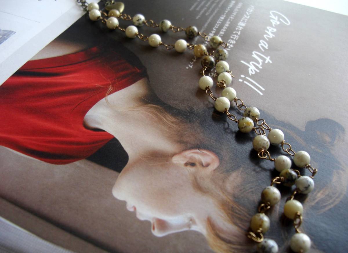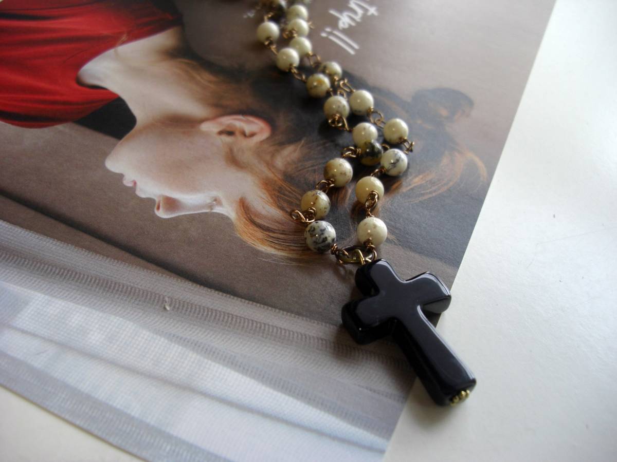 初夏の色を+して・・シリーズです♪大人のベージュ色・・ナチュラルなベージュ色のアフリカンオパールのネックレスです♪アフリカ ンオパールにオニキスのクロスを合わせてロマンチックな表情です♪6ミリの丸玉のアフリカンオパールはトップに3センチ×2センチのオニキスのクロスを合わせました♪長さは90センチ位 で調節自由です♪♪お揃いのネックレス、ブレスレット、ピアスも出品しています♪♪シンプルで長く着けていただけるデザインを考えて 作りました♪ハンドメイドをご理解頂いてノークレーム、ノーリターンでお願いします
