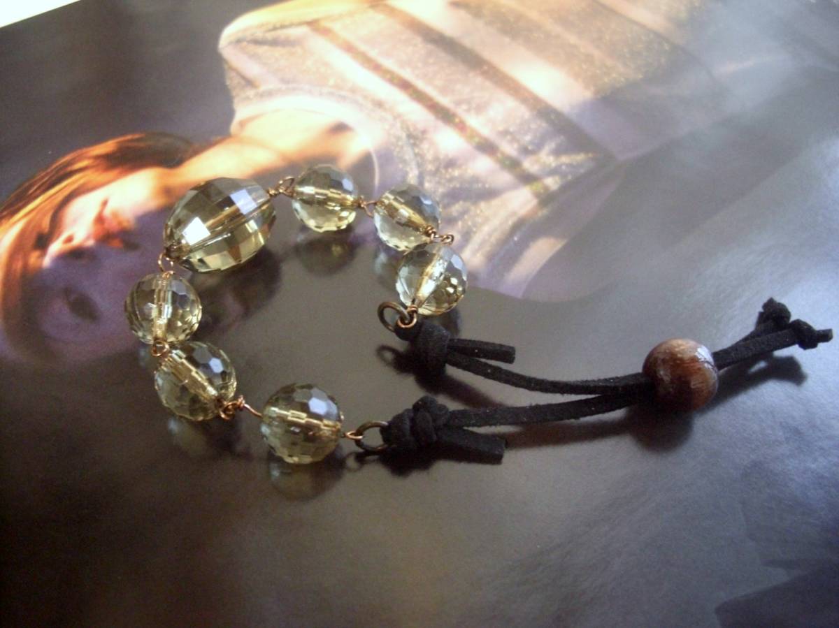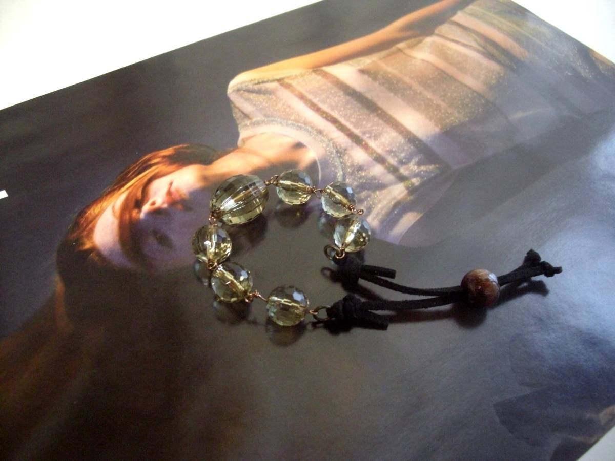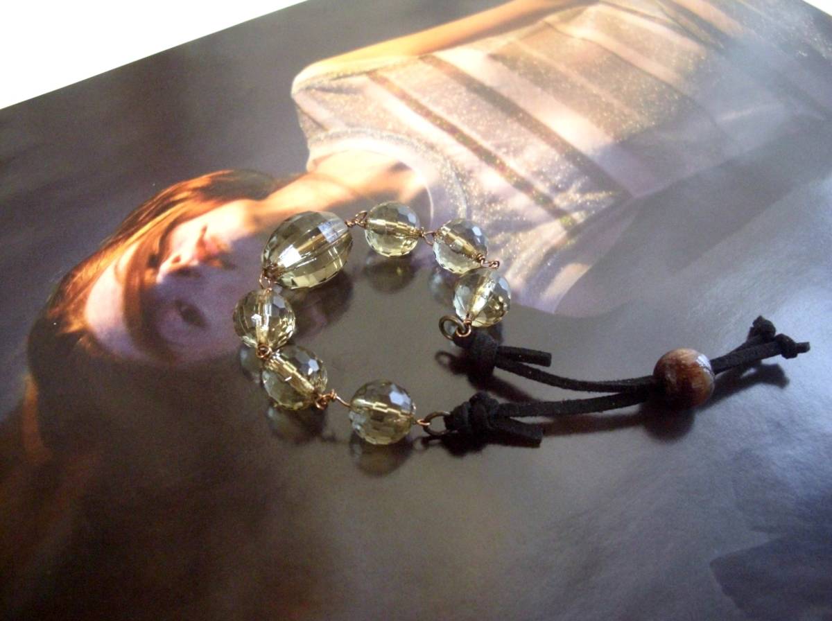 シモーヌの首飾り・・シリーズです♪大人色を繋いで・・神秘的なモス・グリーンの樹脂ビーズのブレスレットです♪12ミリから20ミリ位までのラウンドカッ トやオーバルカットなど大きさ違い、デザイン違いの樹脂ビーズに黒のスェード紐を合わせてさりげなくロマンチックしています♪長さは28センチ位で調節 できます♪お揃いのネックレスも 出品しています♪♪シンプルで長く着 けていただけるデザインを考えて作りました♪ハンドメイドをご理解頂いてノークレーム、ノーリターンでお願いします