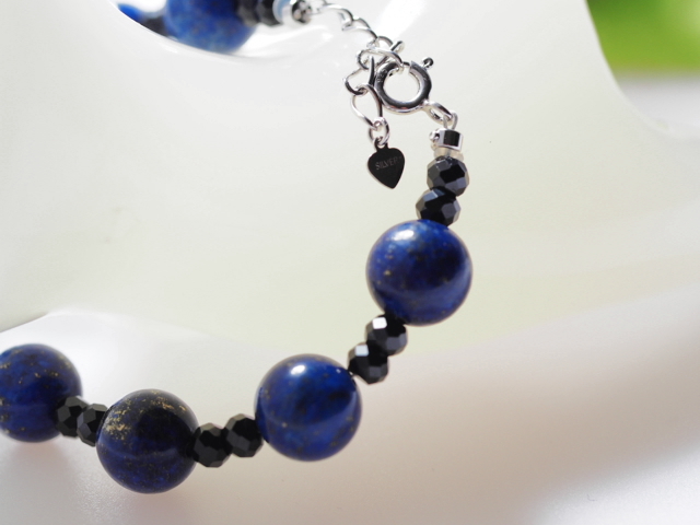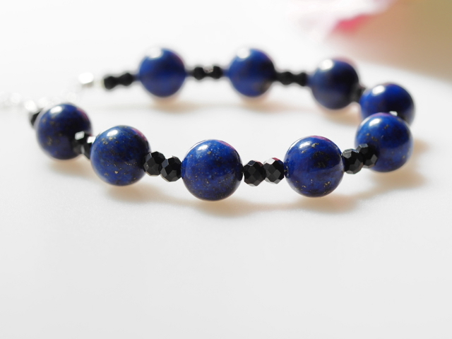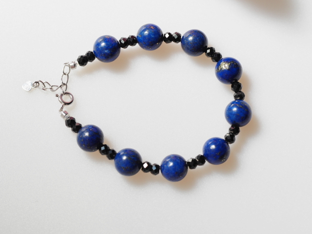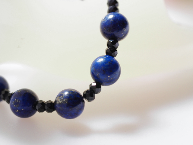 こちらは、深いプルシャンブルーの地色にうっすらと細かなゴールドのパイライトが輝く、高品質の天然色のラピスブレスレット。