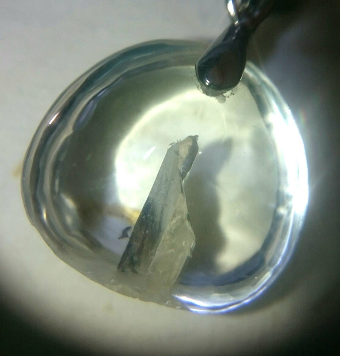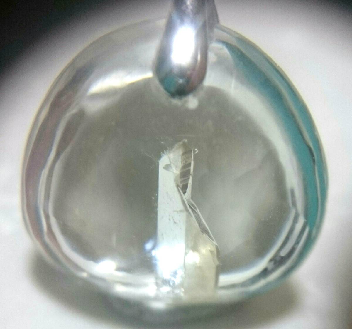 クリアな水晶の中に、長さ10ミリ、最大幅3~4ミリくらいの水晶の結晶が入っています。この水晶は真ん中から上半分が欠けている状態です。微細な欠け、貫入り水晶の根元にヒビがあります。
