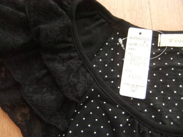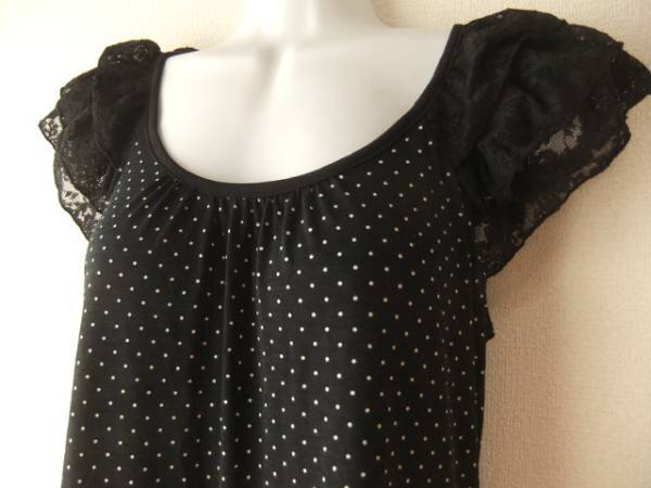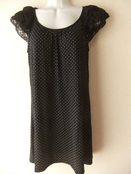 新品L★レース3重袖★ドット黒のストレッチチュニックワンピース