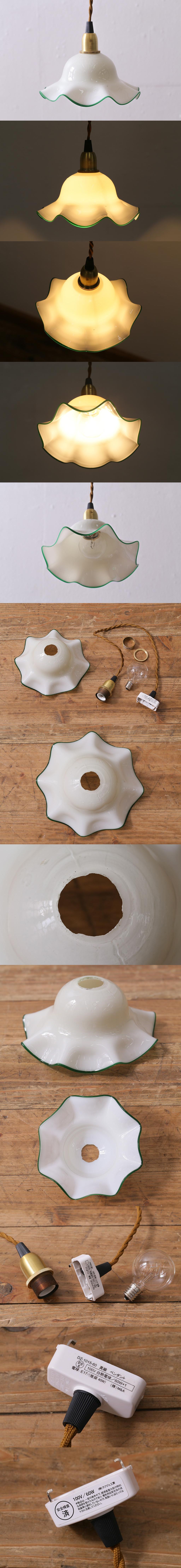 R-040804 ヴィンテージ照明 イギリスビンテージ 小振りな緑縁フリルのミルクガラスペンダントライト(ランプシェード、天井照明)