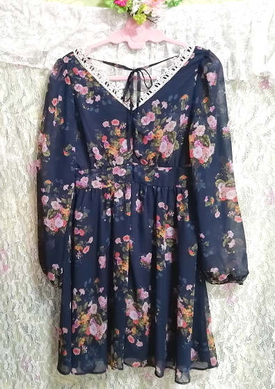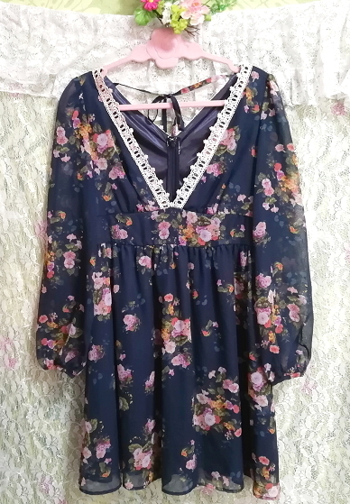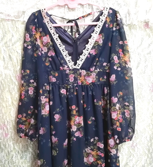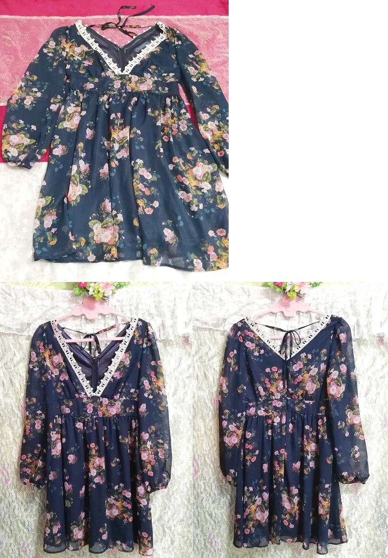 紺ネイビーシフォン長袖花柄ネグリジェチュニックワンピース Navy chiffon long sleeve flower pattern negligee tunic dress