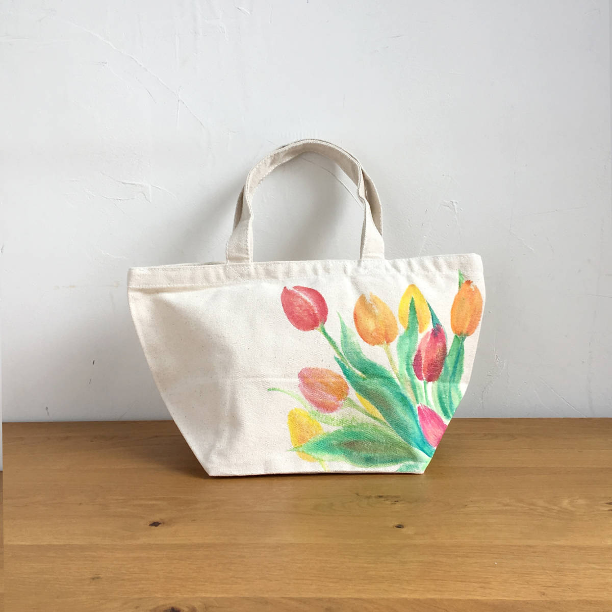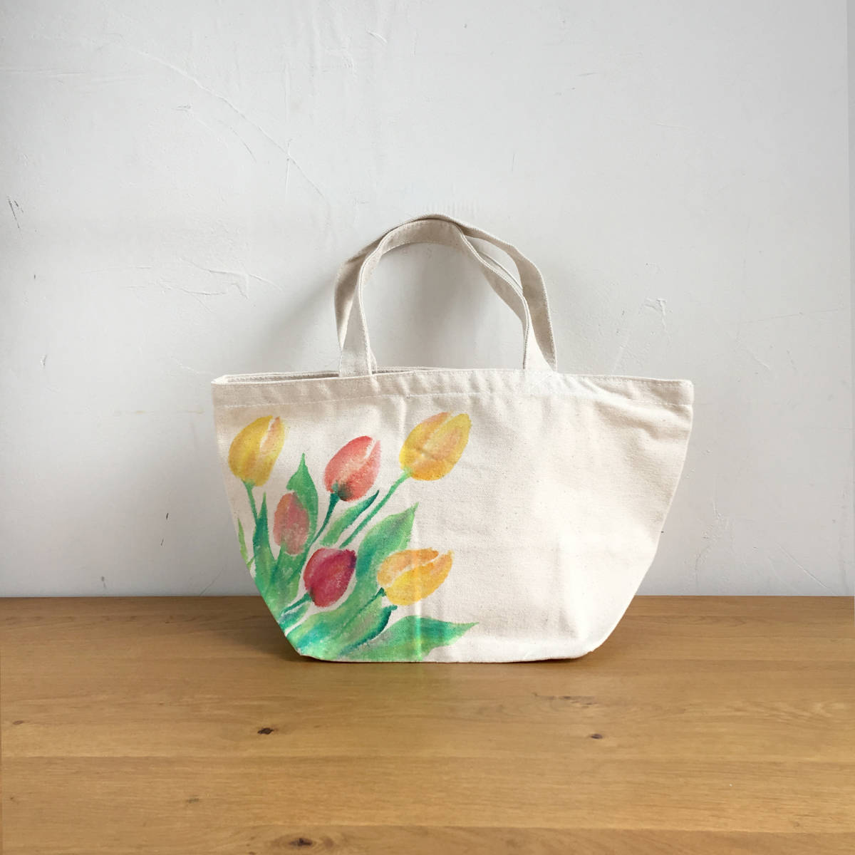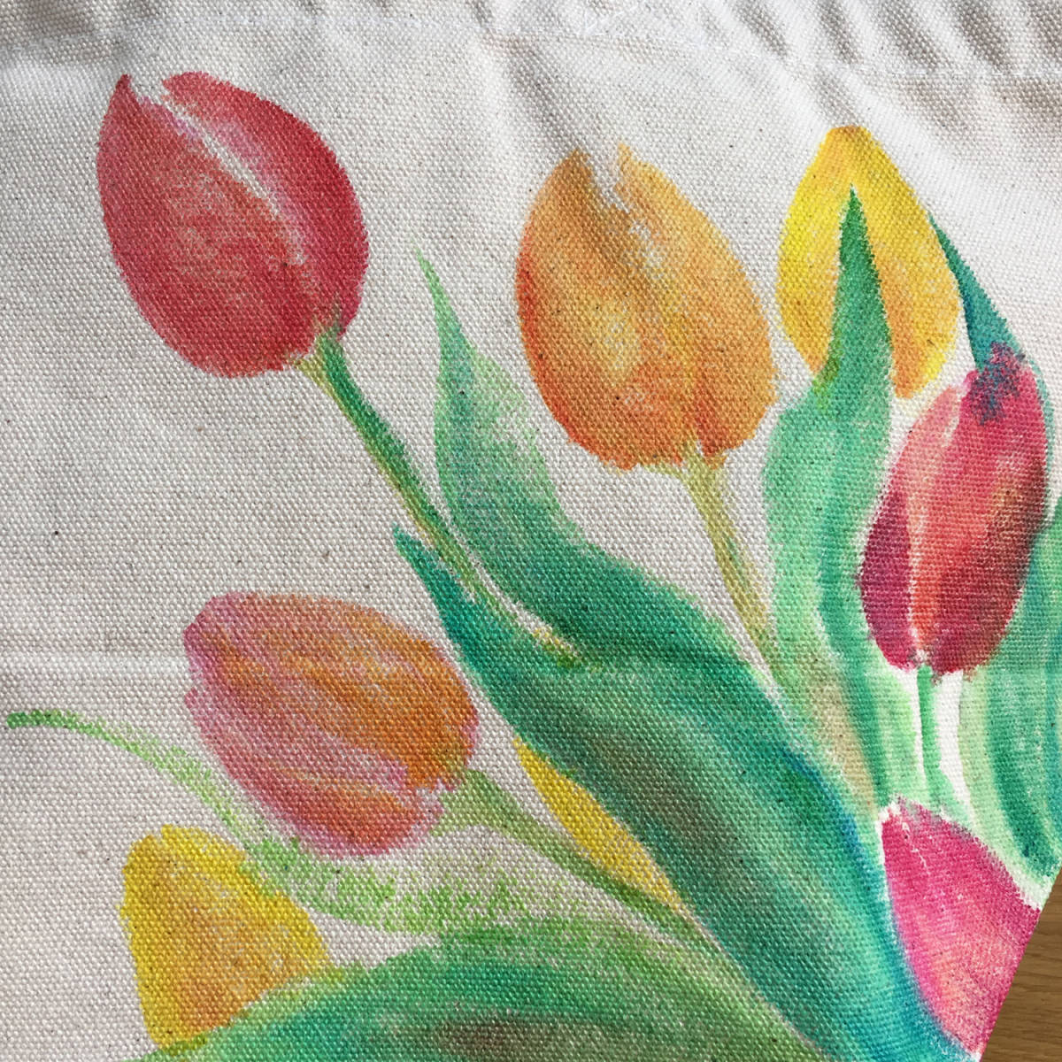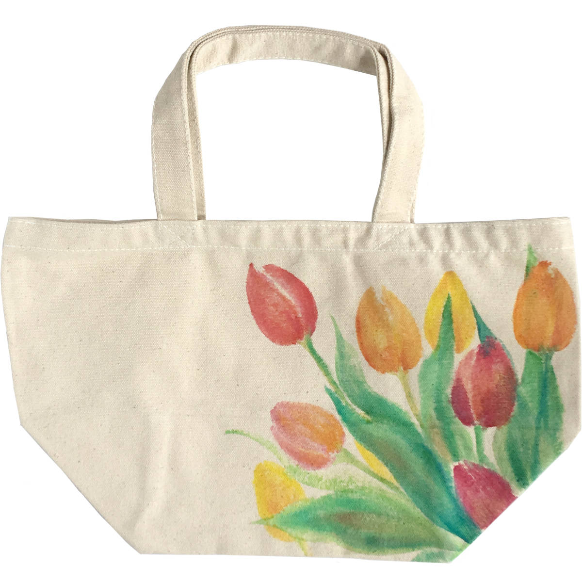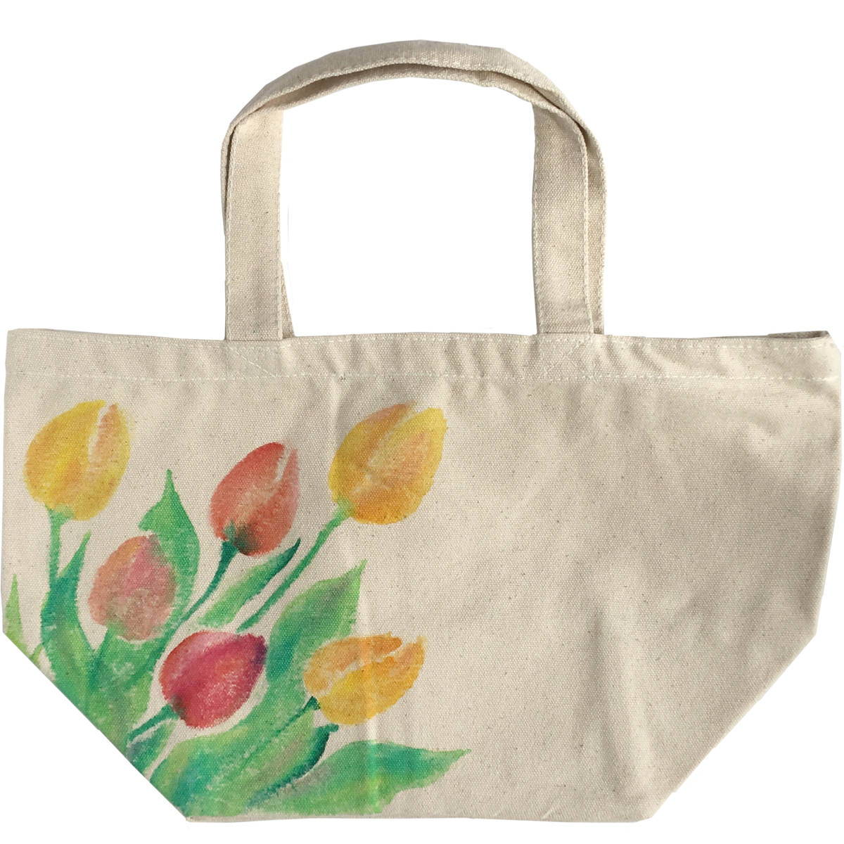ハンドメイド 手描きトートバッグ レディース 手描きチューリップ柄トートバッグ 手描きで描いた花柄のトートバッグ | |||