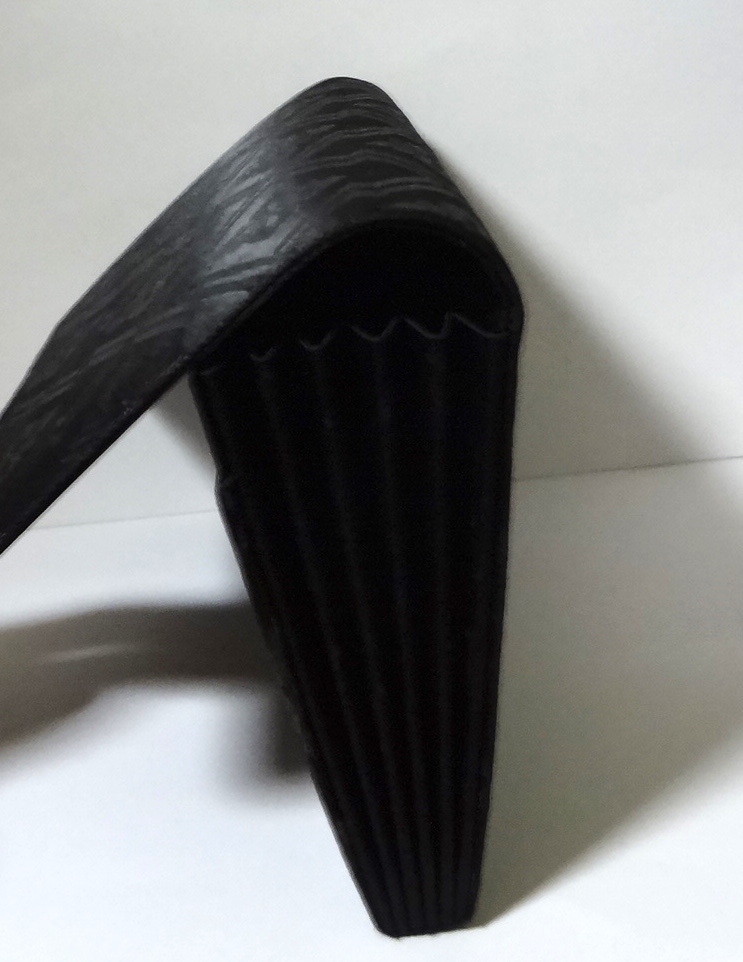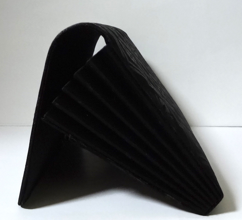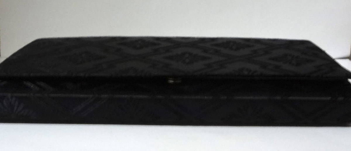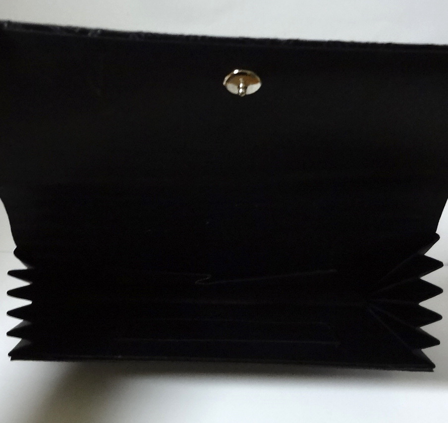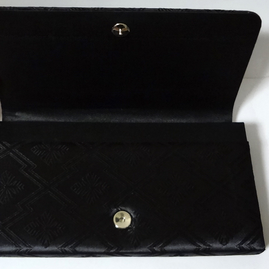 ブラック フォーマル クラッチバッグになります。ボタンを開けると中に内ポケットが2つ有り。扇子みたいに開けると広がるタイプです。特に大きなダメージ,汚れ等もなく状態は良好(未使用保管品)。