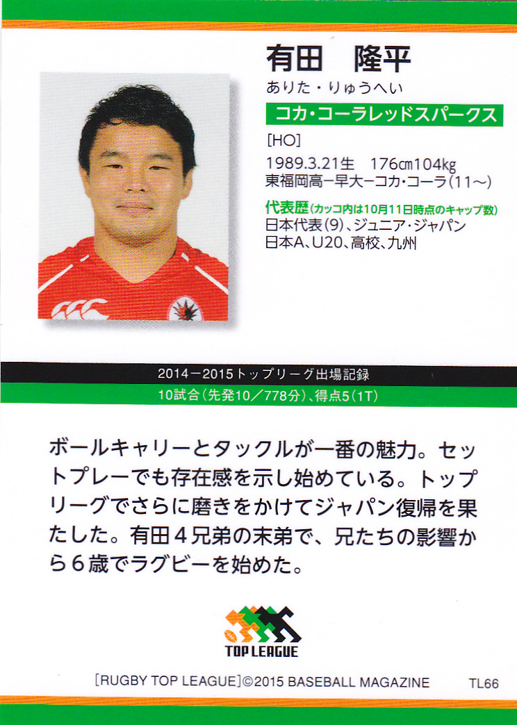 BBMラグビートップリーグ2015-2016 TL66 有田隆平 コカ・コーラレッドスパークス 福岡県 東福岡高校 早稲田大学