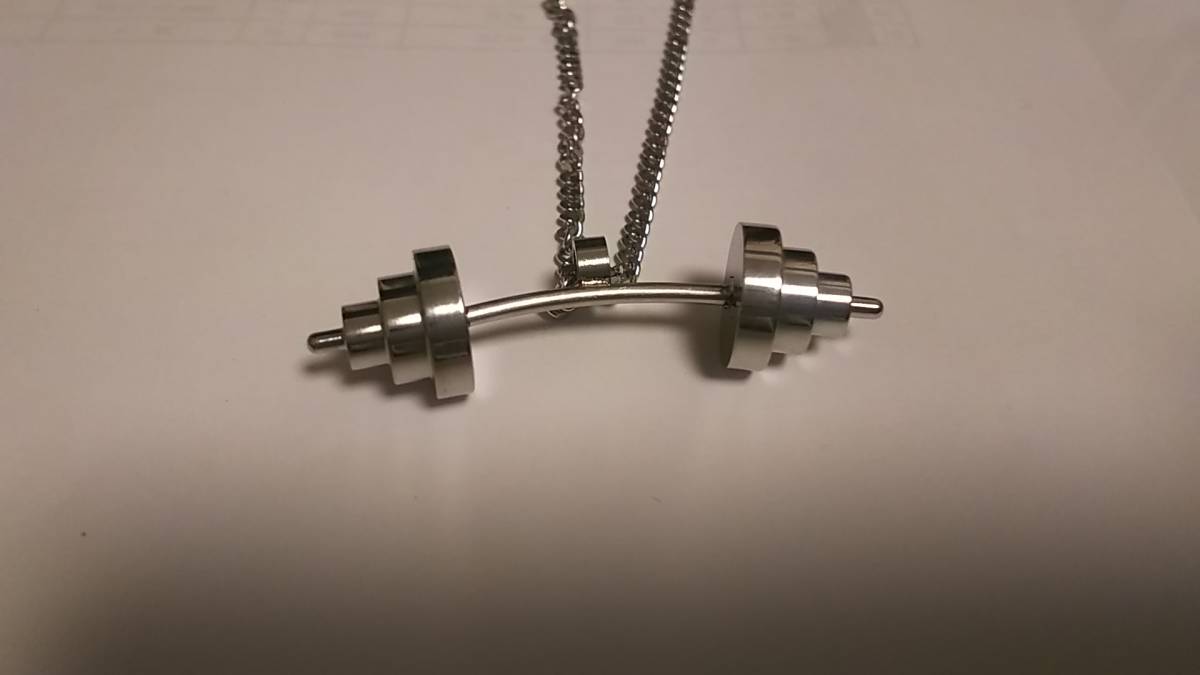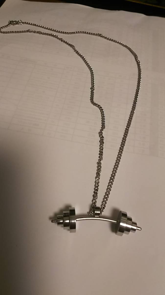 | バーベルがしなったデザインがユニークなペンダントトップの付いたネックレスです。 高級感があり、ジムで着けていたら注目されること間違いなし! 素材はステンレススチールで、サイズは約53mm(幅)x13mm(高)x13mm(奥行)です。 ネックレスの長さは約58cmです。 | ||