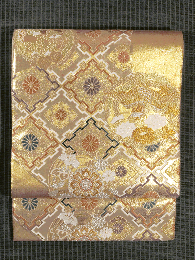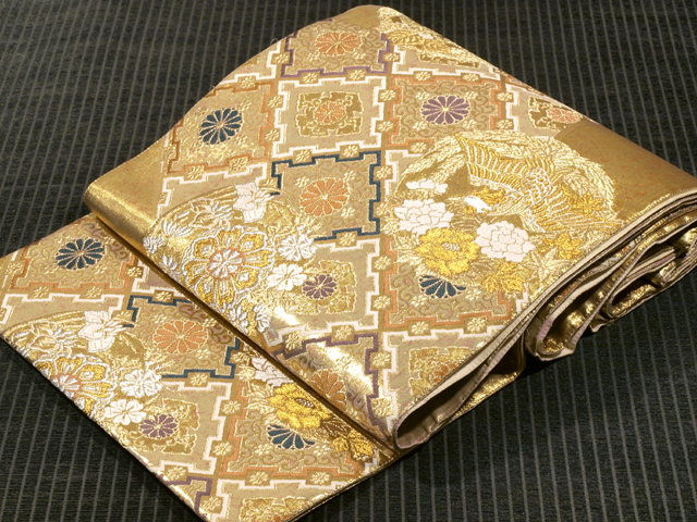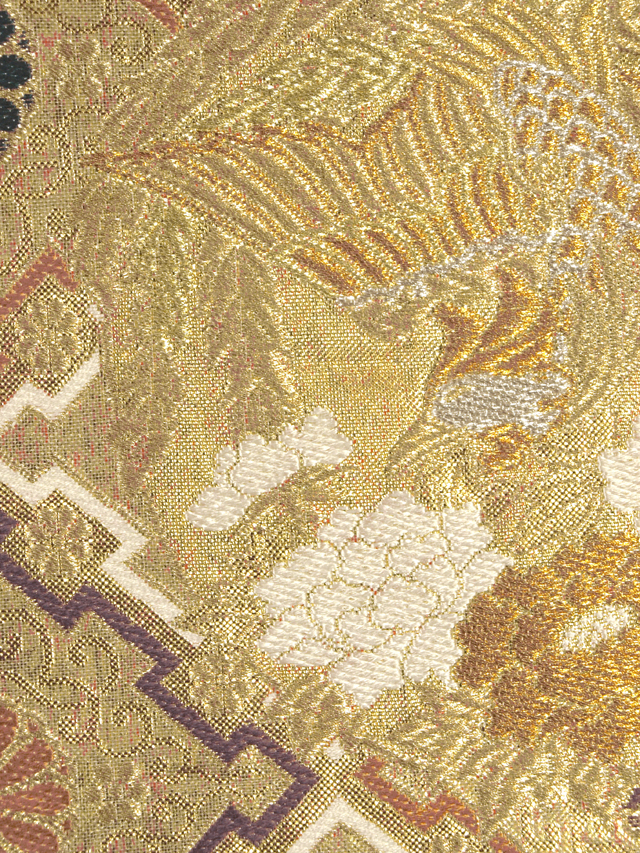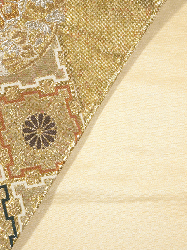 薄金色の地に、東雲(しののめ)色の霜降りの地紋と菊の配された幾何学的なななめ市松格子縞、鳳凰と草花の丸の文様が織り込まれている西陣織の袋帯です。 格調の高い文様が豪奢にあらわされています。伝統文様ながら意匠がモダンな雰囲気を醸しているのは市松格子縞がななめに配され、幾何学的な趣きであらわされているからかもしれません。 ユーズド品で前の折り跡と結びジワがうっすらとあるほか、全体のところどころにごくごくこまかな箔糸の凹みがありますが、目にはつかず、気にはなりません。そのほかに目につくしみやよごれ、褪色などのダメージはなく、きれいな状態です。 |