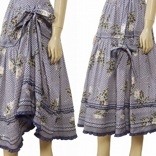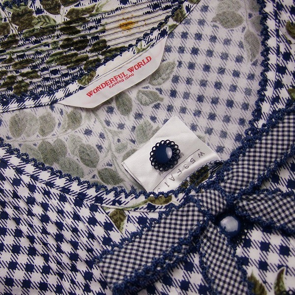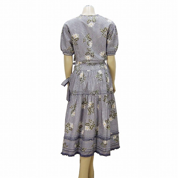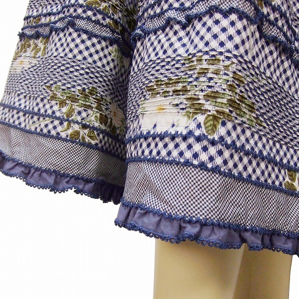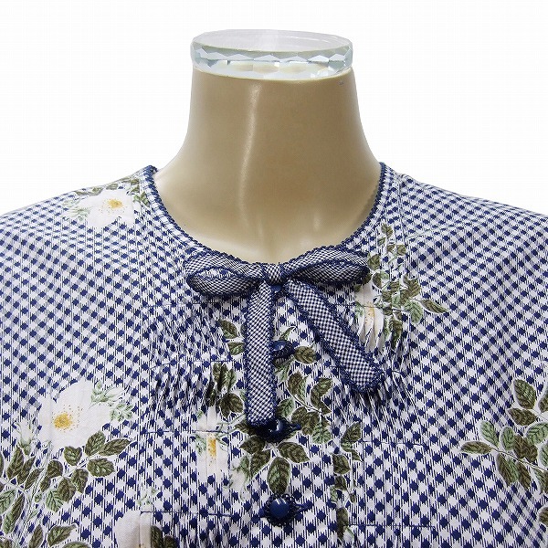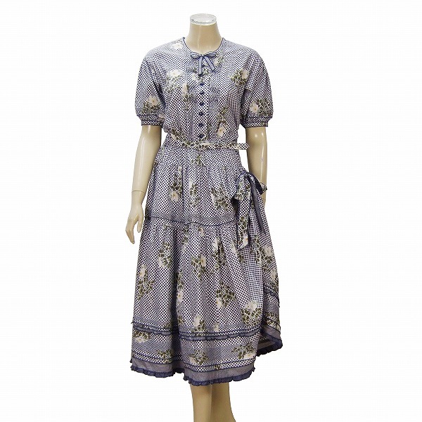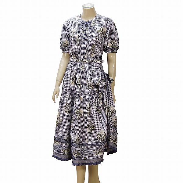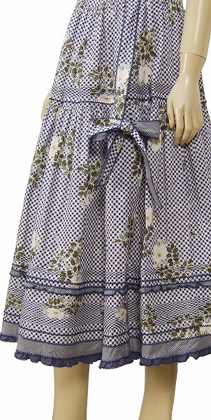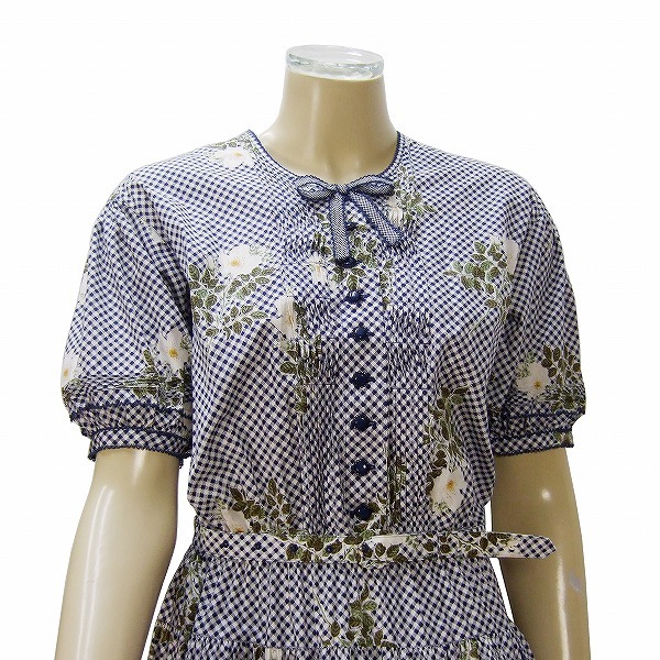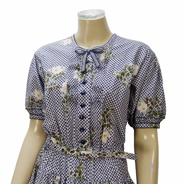 **・゜可愛いシルエットの捲くしスカート(リボン調節)の令嬢パフスリーブロングドレスワンピースです。しなやかな上質コットン(綿)100%のオフ白&ネイビー系チェック柄に清楚な一重バラ柄生地!マーガレット風の花型ボタン留め(衿~ウエスト迄のボタン留)×.。*ウエストは平ゴム入り(付属ベルト付)×2段(3段風)たっぷりギャザー入りティアード×細部にピコフリル&ピコタック(前立ては交互にうねり倒しの立体デザインです。)&チェック柄フリル入り(かぎ編みレーストリム仕立て×バルーン風のパフスリーブ(半袖)全方向に可憐な一重ロングドレスワンピースです。:.。(春~初秋向き)