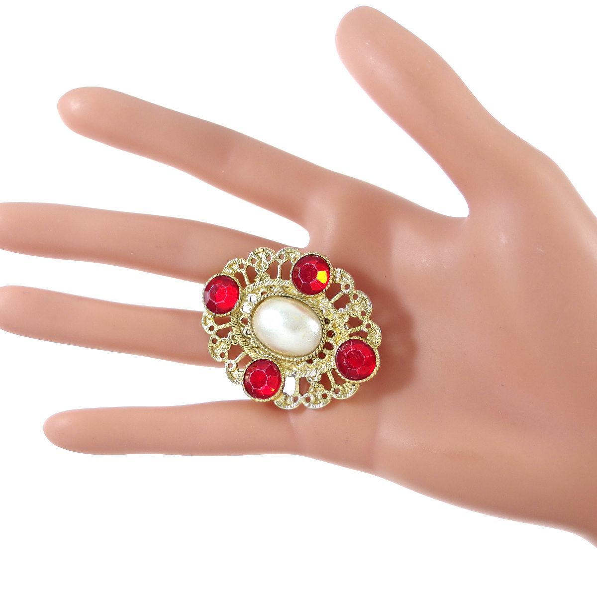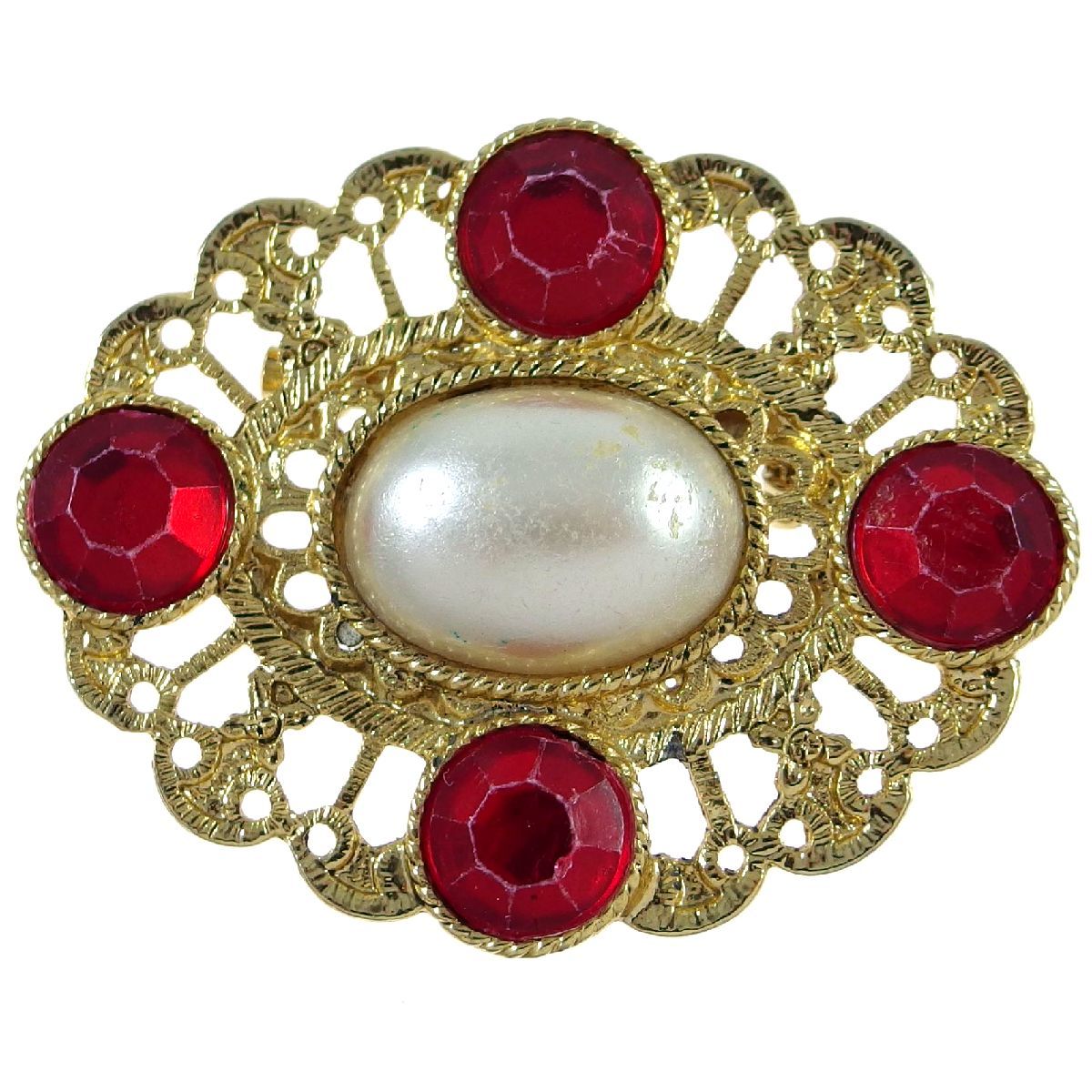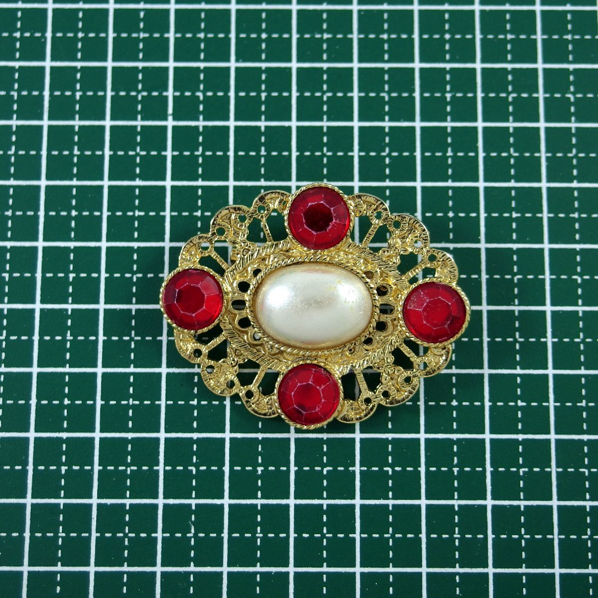 A1104◆ ヴィンテージブローチ ◆ フェイクパール * 赤いラインストーン ◆