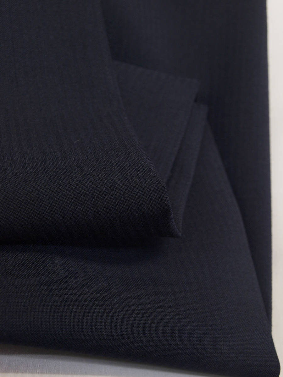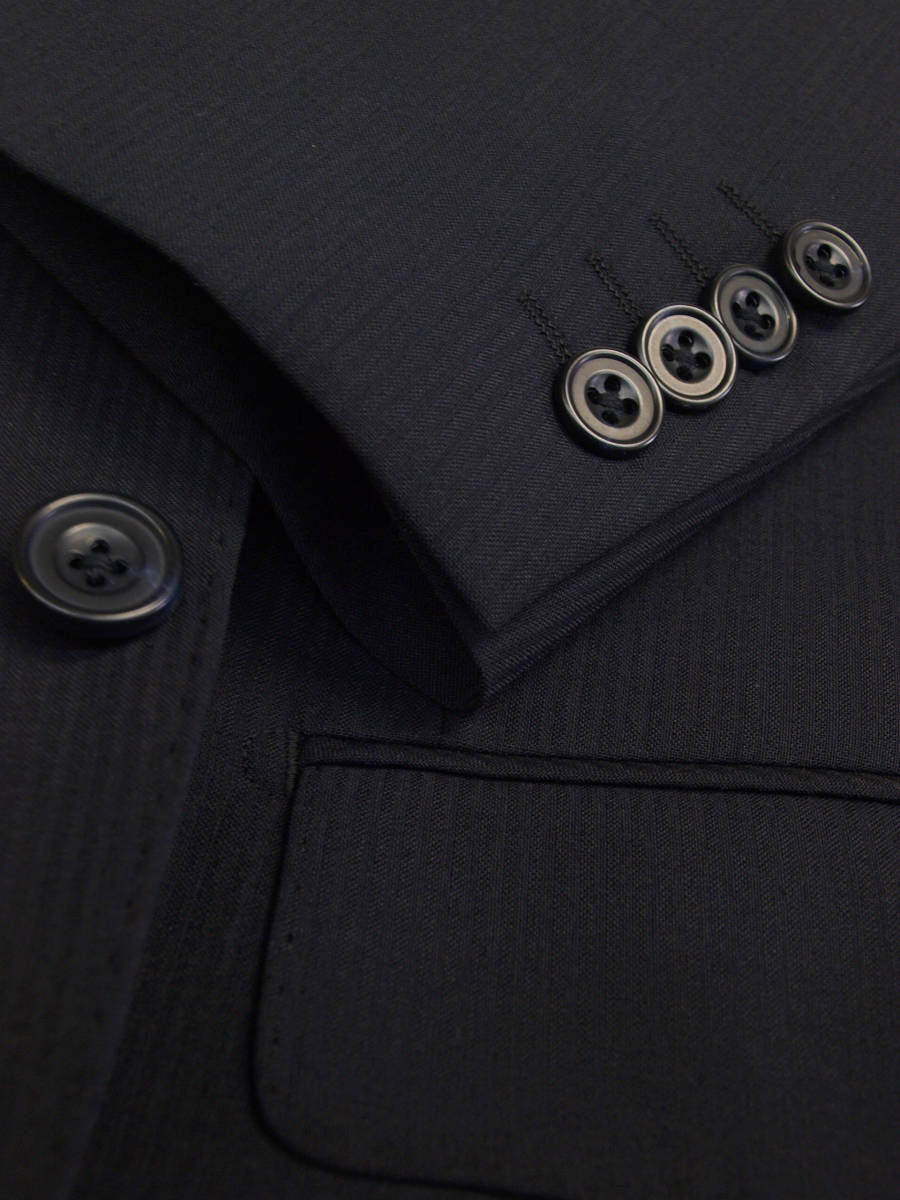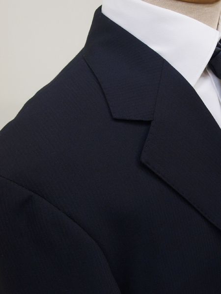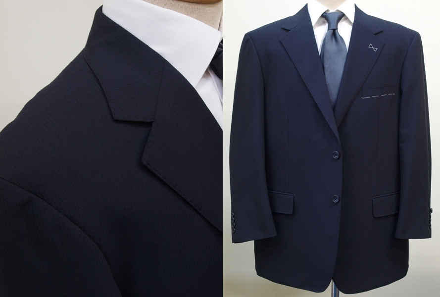 【サイズ】 E5 (EM号相当) 目安の体型 身長165cm~175cm、ウエストサイズ102cm前後 【ジャケット実寸】 肩幅51.5cm 着丈73.5cm 袖丈60cm 脇下部分62cm 身幅59cm 【パンツ実寸】 ウエスト(胴回り実寸)100cm わたり幅36.5cm(股下10cmの部位で33.5cm) 裾幅22.2cm 脇股上29.5cm 前股上32.5cm 股下88cm(裾上げしていない状態/新品) 【素材】 表地:ウール70% ポリエステル30% 裏地:胴裏/ポリエステル100% 袖裏/ポリエステル100% 真夏向けほど透け感があり薄手ではないですが、ほどよいハリがある紳士スーツ用、春夏向けウールブレンド素材を使用 【色】 濃紺色 【柄】 ドビーストライプ柄 【デザイン】 ・ジャケットはゆったりタイプのシングル2つボタンでレギュラータイプ ・パンツの股上は深めでゆったりシルエットのツータックスラックスです。 春~夏~秋にかけて春夏メインのシーズン対応商品 【縫製仕様】 ・ジャケットはシングル2つボタン、ノッチドラペル、袖口ボタン4つ、サイドベンツ、内ポケット4つ(小ポケット2つ含む)、背抜き(春夏物) ・パンツはツータック、膝裏当て付き、脇ポケット斜めけ、後ろポケット両玉縁で左のみボタン付き、フロントはファスナーでホック仕様/うちかけボタンあり、シロセット加工 きちんとしたビジネス仕様の縫製仕立てで仕上がっております。