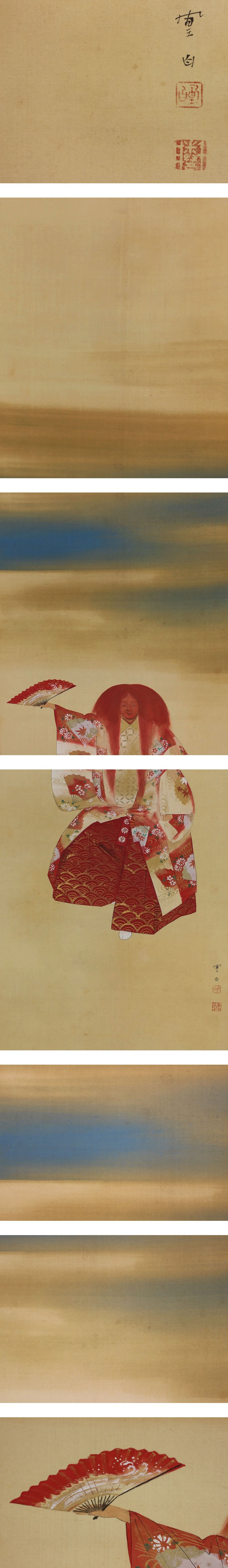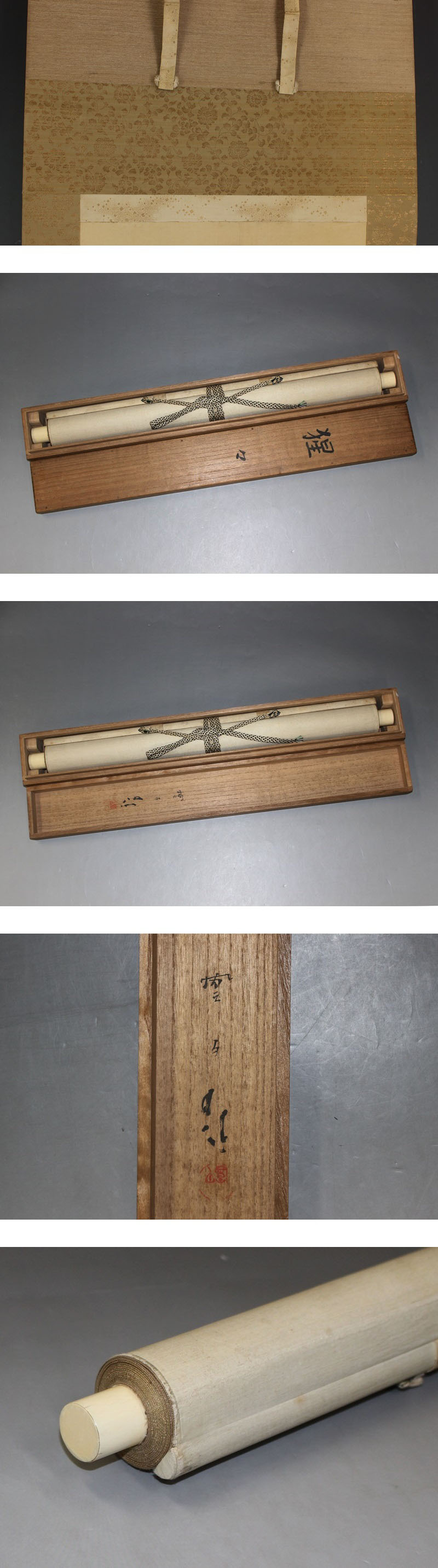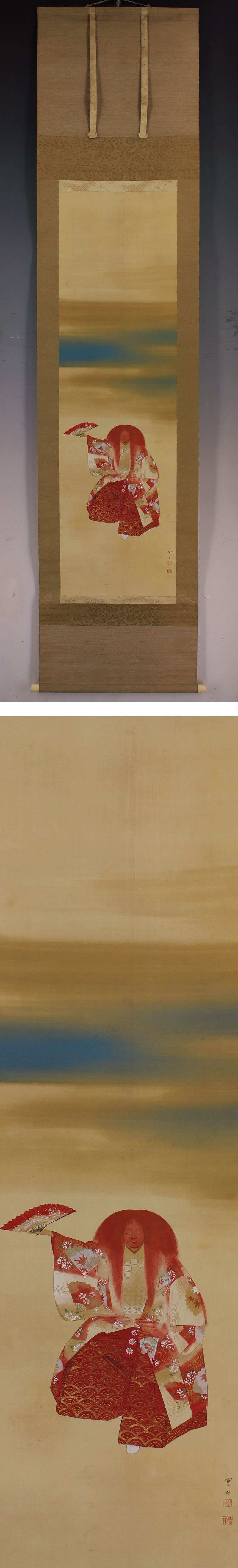 三宅凰白 みやけ-こうはく(1893-1957) 大正-昭和時代の日本画家。 明治26年5月2日生まれ。三宅呉暁(ごぎょう)の次男。山元春挙に師事。昭和5年「花旦」が帝展特選。春挙の没後は画塾早苗会の幹事となり,のち耕人社を結成した。11年から24年まで母校京都市立絵画専門学校の助教授。昭和32年2月26日死去。63歳。京都出身。本名は清一。 本紙は、染み、汚れ、軽い皺、ヤケがあります。 表装は、染み、軽い汚れ、軽い折れ、皺、軸先にヒビがあります。 【サイズ】 作品 横約36cm×縦約126cm 表装 横約49.5cm×縦約214cm |