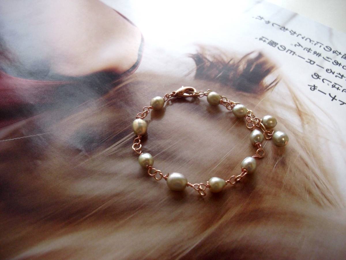着ける幸せ・・シリーズです♪飾らないパール・・ナチュラルな淡水パールのブレスレットです♪シャンパンベージュのパールにピン ク ゴールドのチェーンを合わせてロマンチックしています♪パールは表情豊かなバロックパールなのでシンプルなデザインに仕立てました♪♪6×8ミリ位の小粒のパールのブレスレットは全長23センチ位で調節自由です♪お揃いのブレスレットやネックレスやピアスも出品しています♪ハ ンドメイドを ご理解頂いてノークレーム、ノーリターンでお願いします