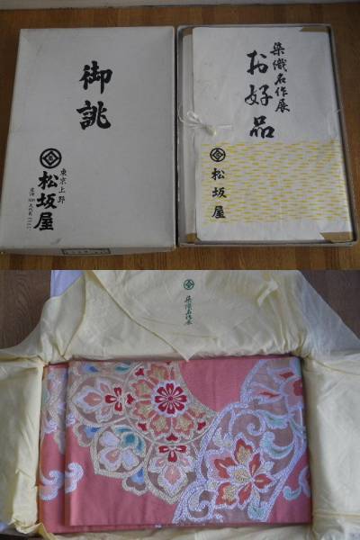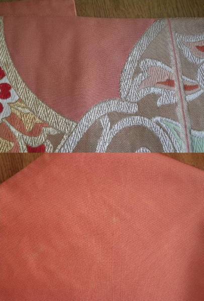 30年程前、上野松坂屋で約350万円で購入した袋です。サーモンピンクの地に金をはじめ華やかな柄が手刺繍で施されとても素敵です。大事に保管してきましたが着用する機会が無いためご希望の方にお譲りいたします。クリーニングして保管していましたが、数カ所細かいしみがございます(3枚目写真参照)が、破れのような痛みはございません。サイズは幅約31㎝、長さ440cm。柄が華やかであまりないものですので人とは違った装いをお好みの方に最適です。あくまで中古ですのでその点ご了解いただける方のみご入札ください。素材はもちろん絹になります。上質な生地、縫製&刺繍ですので普通にもお召しいただけますが、見栄えのする個性的なデザインですので、舞台衣装にも映えるお品です。