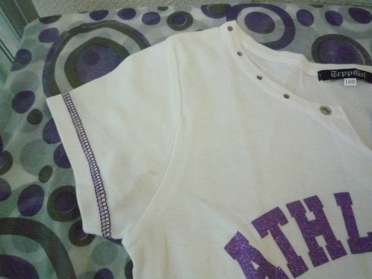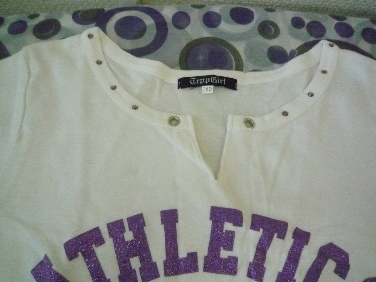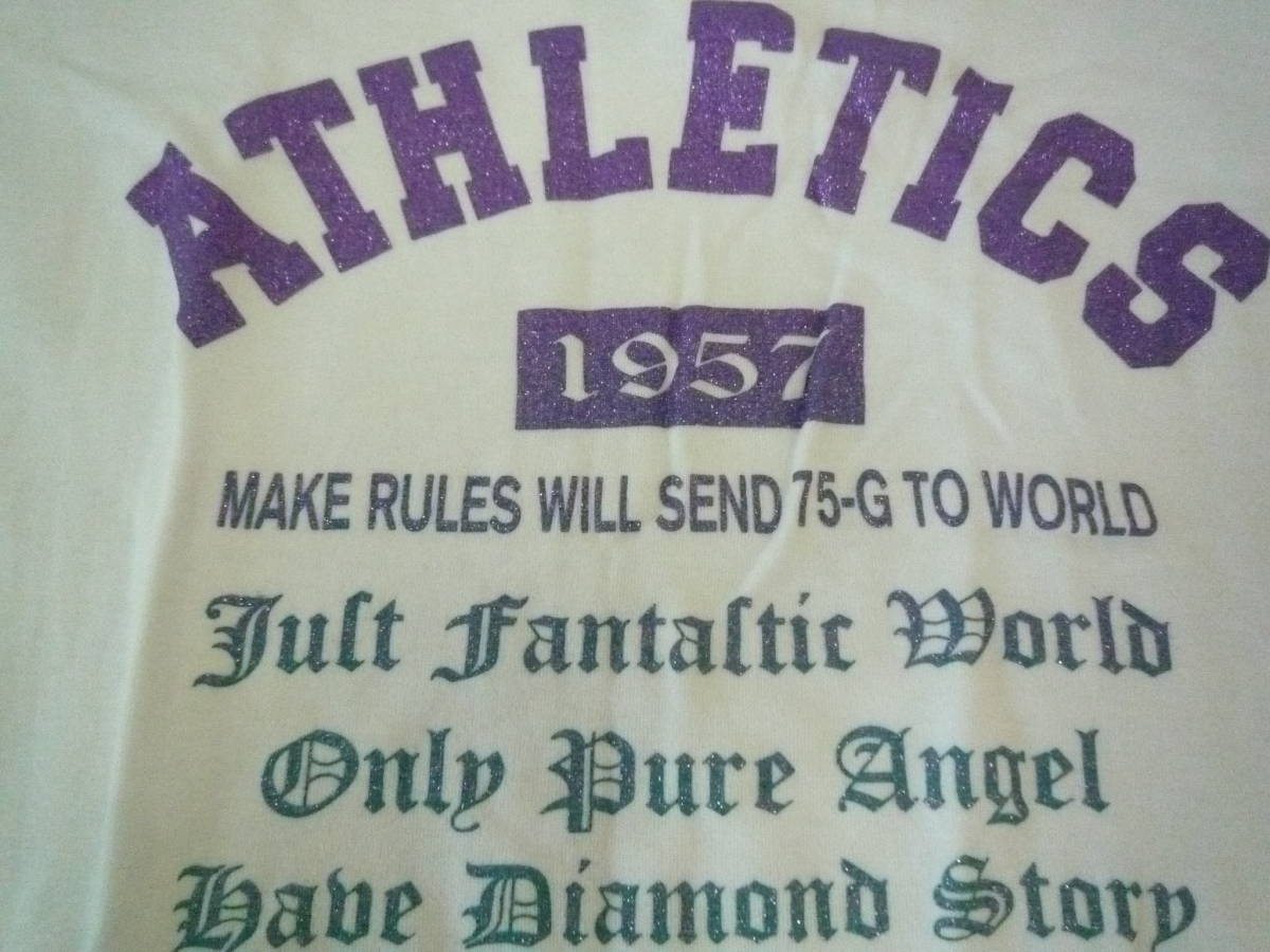 ★半袖 Tシャツ ATHLETICS ロゴ ラメ 首周り ラインストーン 袖口 ステッチ 白×パープル(160)