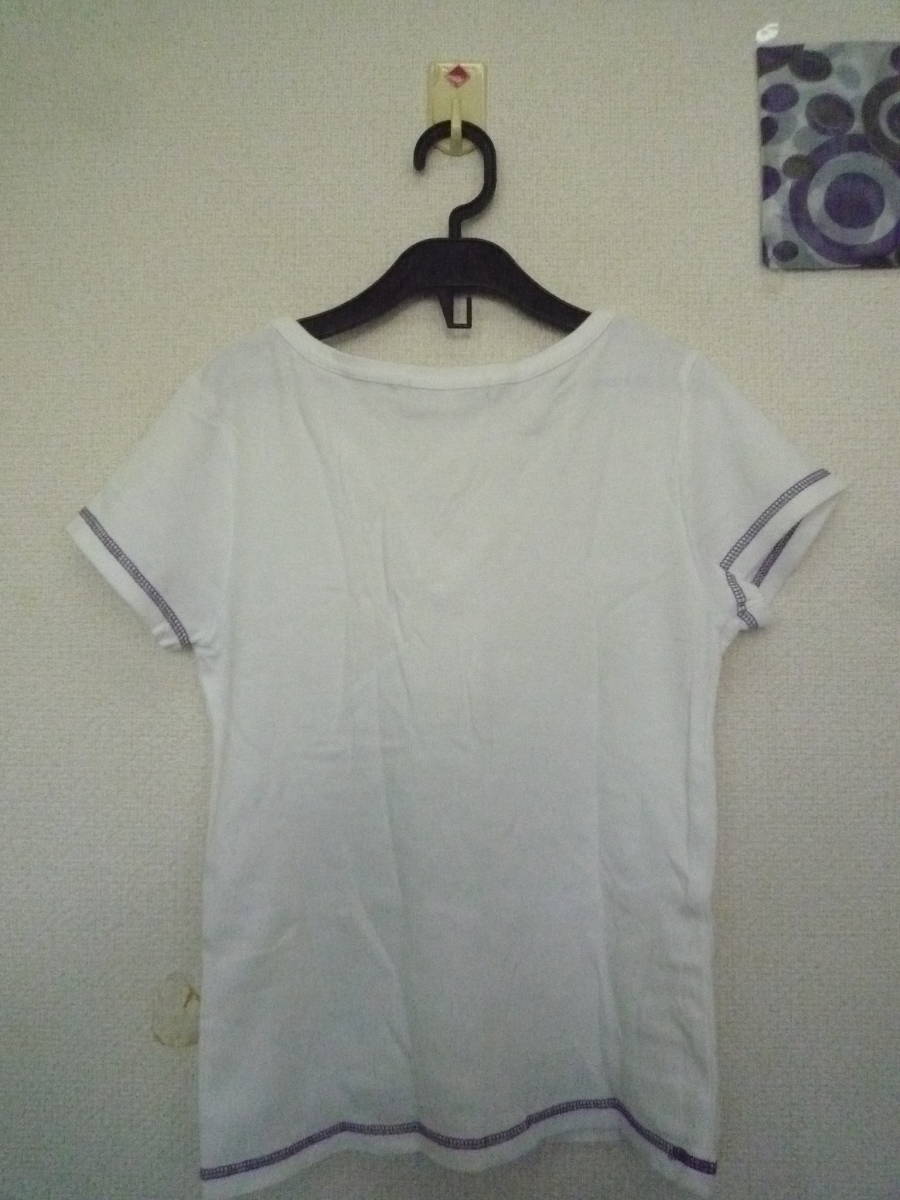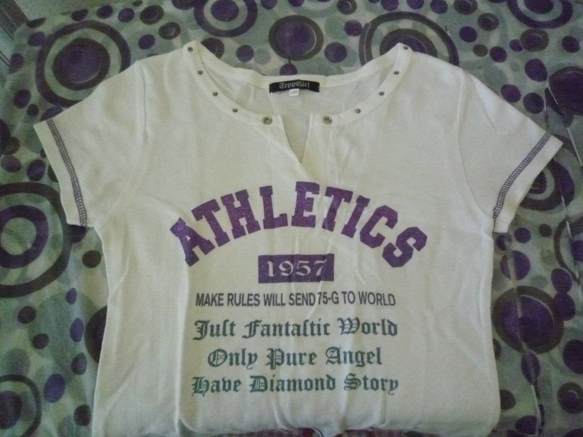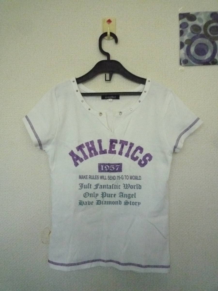 ★半袖 Tシャツ ATHLETICS ロゴ ラメ 首周り ラインストーン 袖口 ステッチ 白×パープル(160)