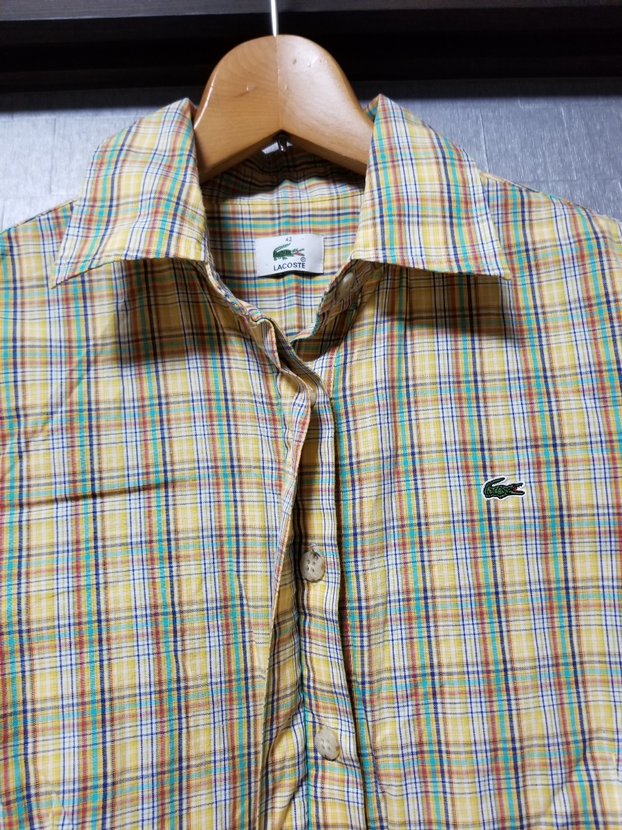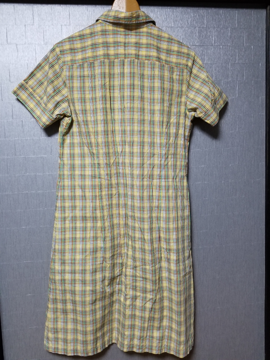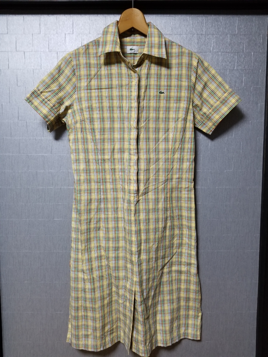 こちらはお馴染みの定番ブランド、LACOSTEの限定レディース半袖チェック柄ワンピースになります。 もちろん株式会社ファブリカのタグが付いた日本正規品の品で、色は薄めのイエローベースになります。 素材は綿100%のシャツ生地で、サイズは42の表記で、着丈は襟上から94㎝、肩幅39㎝、身幅45㎝になります。 着用は4回のみですので、これといった汚れやキズなどはありません。 画像でも確認できるように、お馴染み胸のワニワッペン、色鮮やかなチェック柄デザイン、ブランドネーム刻印入りボタンなど、このモデルならではのさりげないこだわりが見受けられます。 今回格安からのスタートになりますので、お早めにどうぞ。 お支払いはかんたん決済、又は銀行振込みにてお願いいたします。