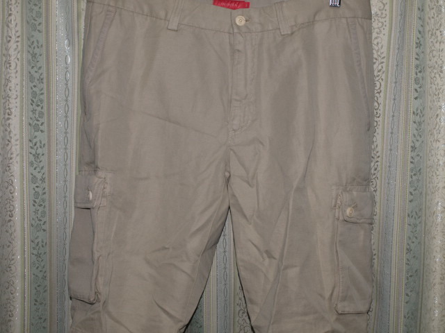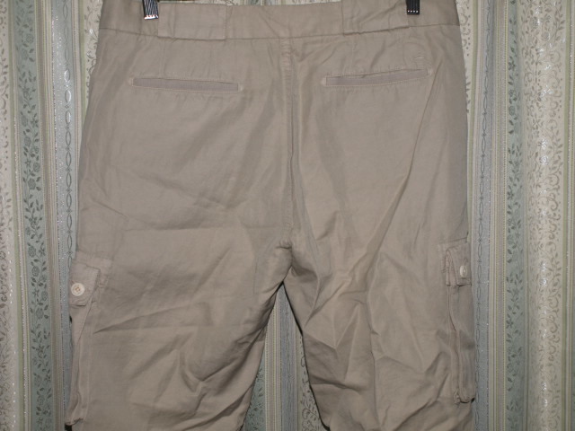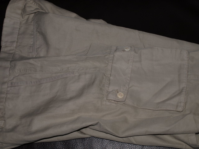 ◆カラーはベージュ、立体的なカーゴポケット付きで、素材はコットン54%・麻46%です。