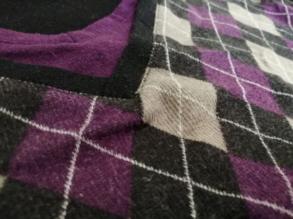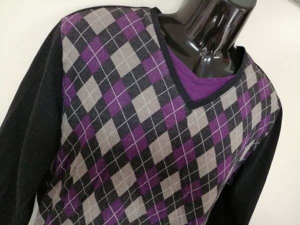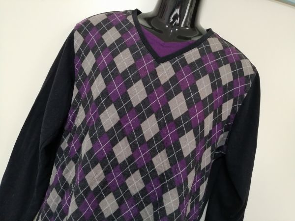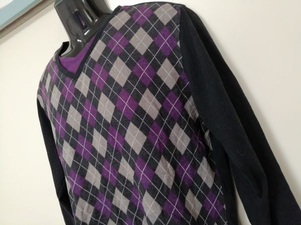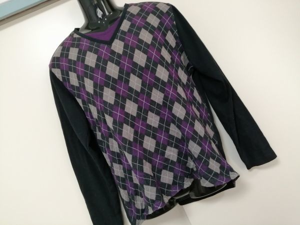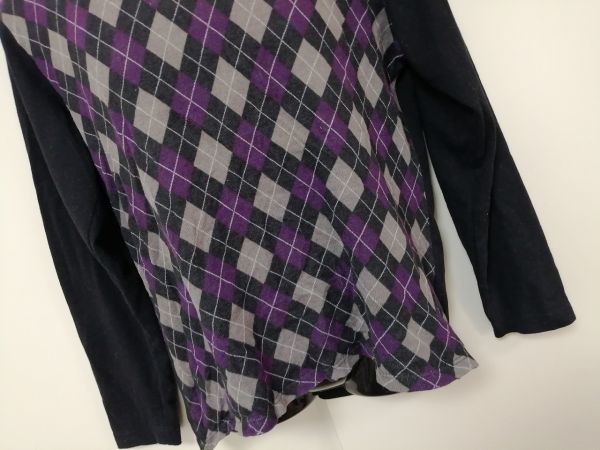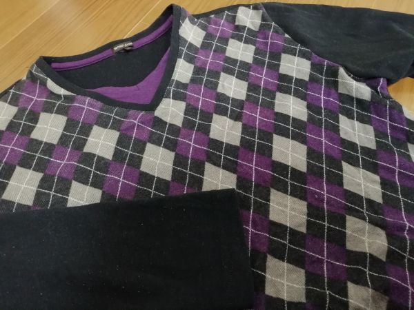 kkyj2440 ■ MIND GAMES ■ Tシャツ カットソー トップス 長袖 レイヤード風 重ね着風 アーガイル パープル 紫×黒 XL