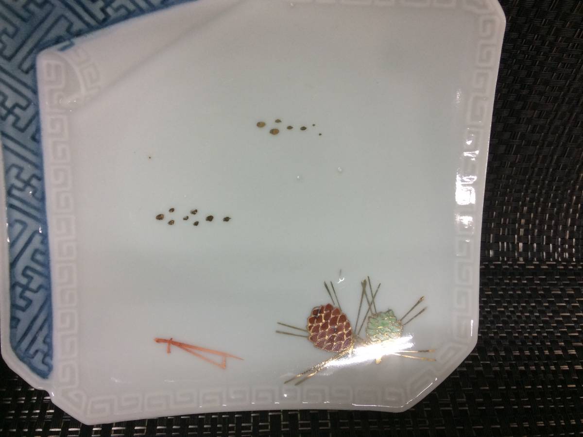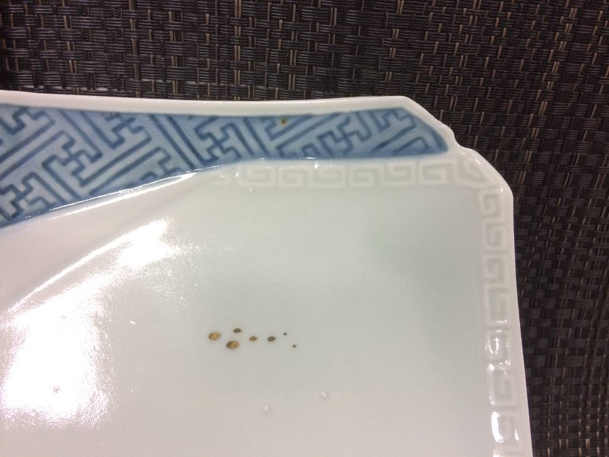 • 絵柄はプリントですが、意外に凝った造りです。縁の部分の2カ所はまるで欠けているように見えますが2枚の紙を重ねた様子を表現しているようで、なかなか面白い造りです。染付の絵柄と金色の釉薬の絵柄は手描きだと思われます。素地は磁器です。