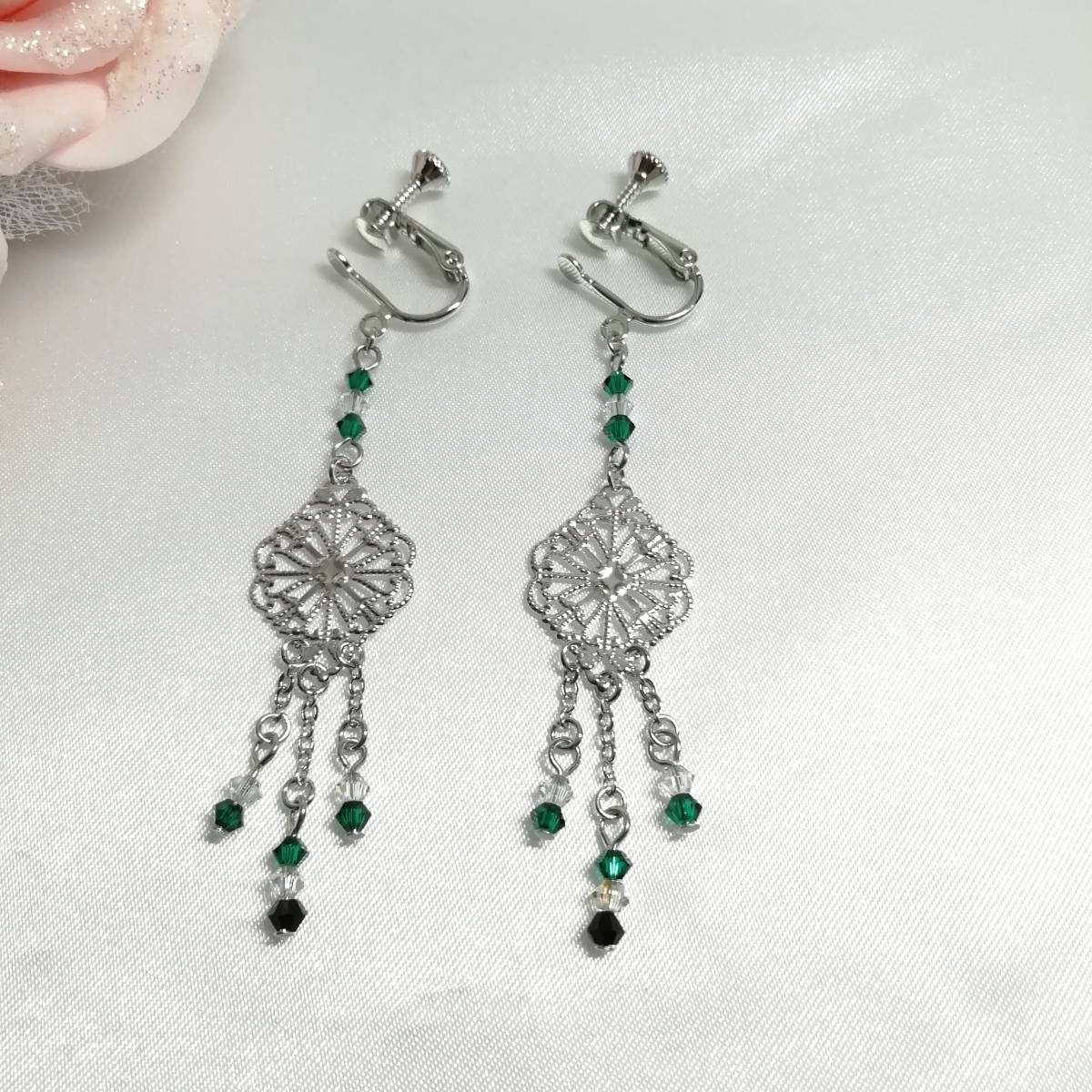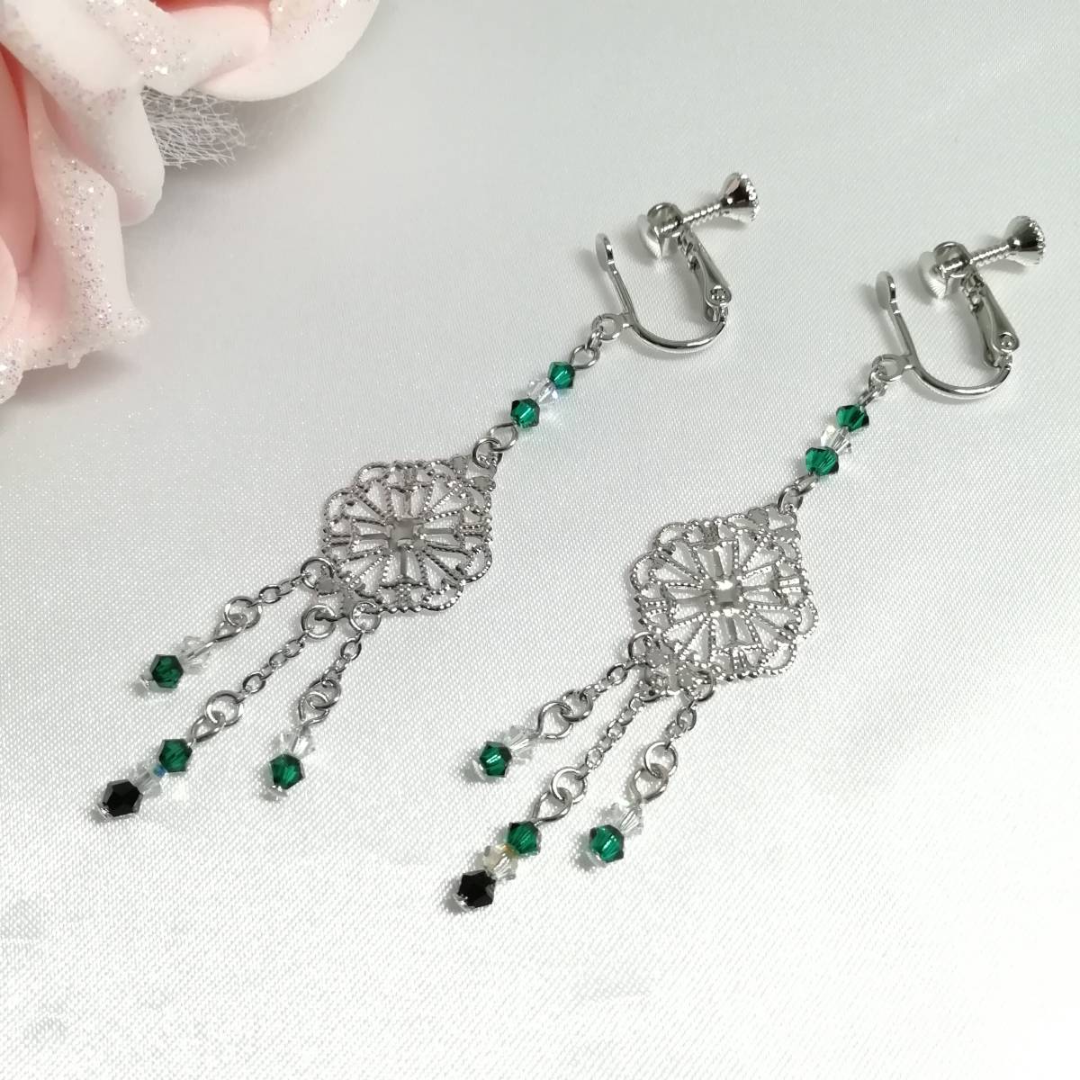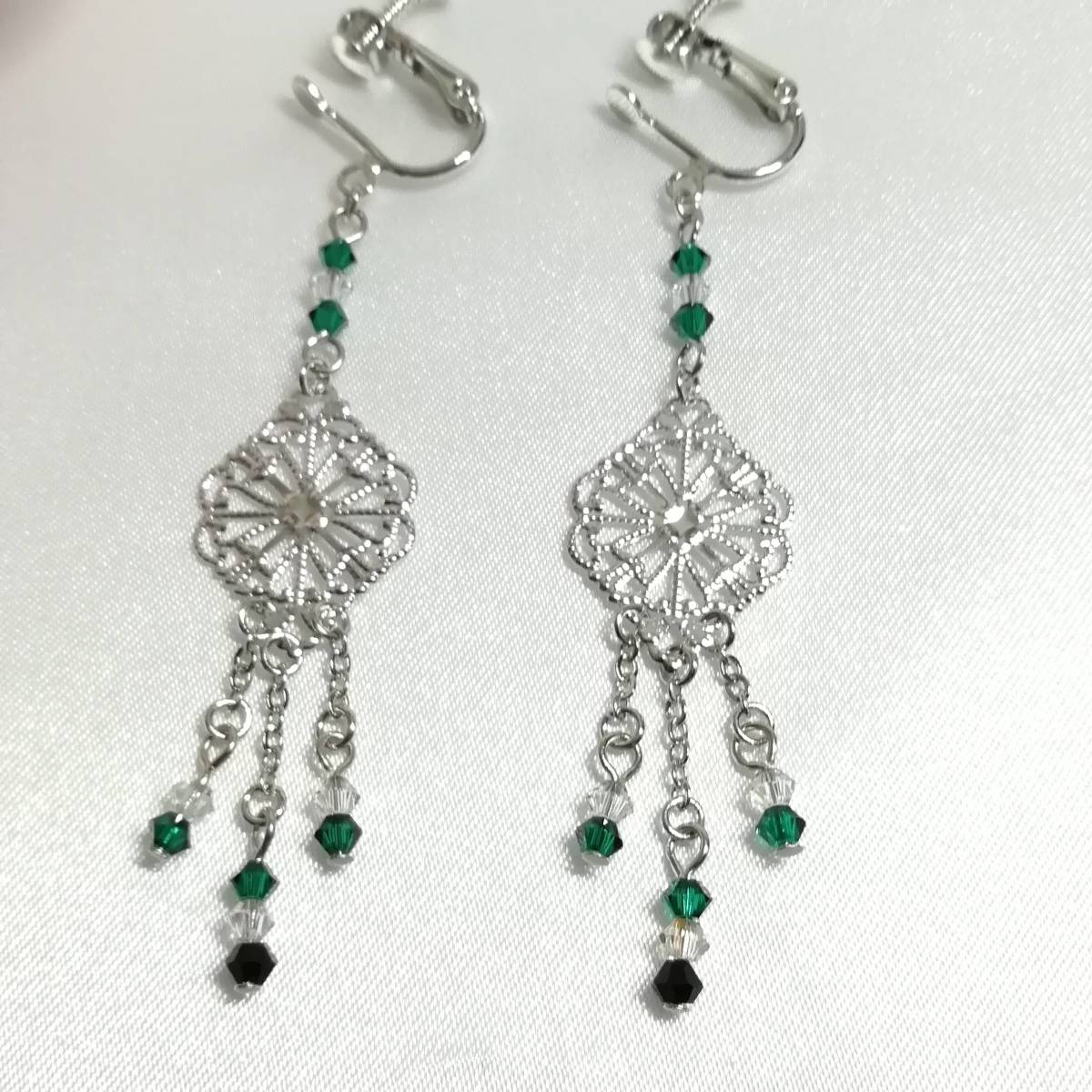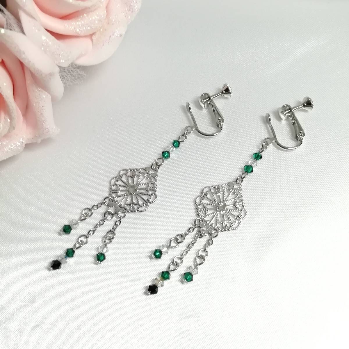 | ★商品内容★ ★レースパーツと緑と黒のハンドメイドイヤリング★シック・スワロフスキー・上品・ゴージャス・シルバー・エメラルド・グリーン・クリスタル・黒 シルバーのレースパーツと小粒のスワロフスキーとを組み合わせた シックでゴージャスなロングイヤリングです*・.**.☆・。**.・。☆*・**。・ 吊る下げたスワロフスキーの小粒ビーズが 光の反射でキラキラととても綺麗に煌きますます*・.**.☆・。**.・。☆*・**。・ 普段使いはもちろん、お出掛けや お洒落のワンポイントなどにも最適です・。**.☆・。*・**☆*。・. 【素材】 スワロフスキー5328エメラルド(オーストリア製)3mm スワロフスキー5328クリスタル(オーストリア製)3mm カットガラスビーズジェット3mm レースパーツロジウム15mmx22mm 小粒チェーンシルバー カンより垂れ下がる長さは、約6㎝です。 Eー564 ★商品状態★ ・画像と実物の色味が多少異なる場合があります。 ・緩衝材(プチプチ等)を使用し、防水梱包でお届け致します。 ★注意事項★ ***~ご購入前に必ずお読み下さい~*** ***商品について*** *一点一点心を込めて作っておりますが、手作りなため多少の歪み等あるかもしれません。 手作りの味わいと、世界で一つだけの作品とお考えいただければ幸いです。 *デリケートな商品ですので、強く引っ張ったりすると破損する事もあります。 お取り扱いにはご注意ください。 *写真も完璧な色合いの表現にはなっていない場合もあります。 *基本イヤリング金具は跳ね上げ式ネジ付きを使って作成しています。 ご希望によりピアスへの変更も承っております【フックピアスへの変更無料/キャッチピアスへ変更(別途追加料金120円が必要です)】 ~ご注文の際にメッセージ欄よりお申し付けください~ 尚、金具変更のご希望が無い場合は、掲載された写真の金具にてお送り致します。 *金属アレルギーや化学物質アレルギーなどへの対応はしておりませんので、ご心配な方はご遠慮下さいますようお願い致します。 *永くご愛用頂くために、ご使用後は柔らかい布等で軽く拭いてください。 ***ご質問について*** *ご購入前にお願い致します。 日中は仕事をしておりますので、ご返事が直ぐに出来ない場合がございます。 出来る限り早い対応を心がけますが、ご了承ください。 また、発送までには、お振込み確認後、翌日の発送を心がけておりますが、仕事の都合により2~3日程かかる場合がございます。(その際にはナビにてご連絡いたします) お急ぎの場合は、極力対応いたしますが、場合によっては対応致しかねる事もあります。ご了承下さいませ。 落札後4日以内にお手続き、ご連絡が無い場合は落札者都合で削除致します。 発送日指定・ご入金の予定が1週間以上先をお考えの方は、入札の前に質問よりご連絡くださいませ。 予めご了承の上、ノークレーム・ノーリターンでお願い致します。 | |||