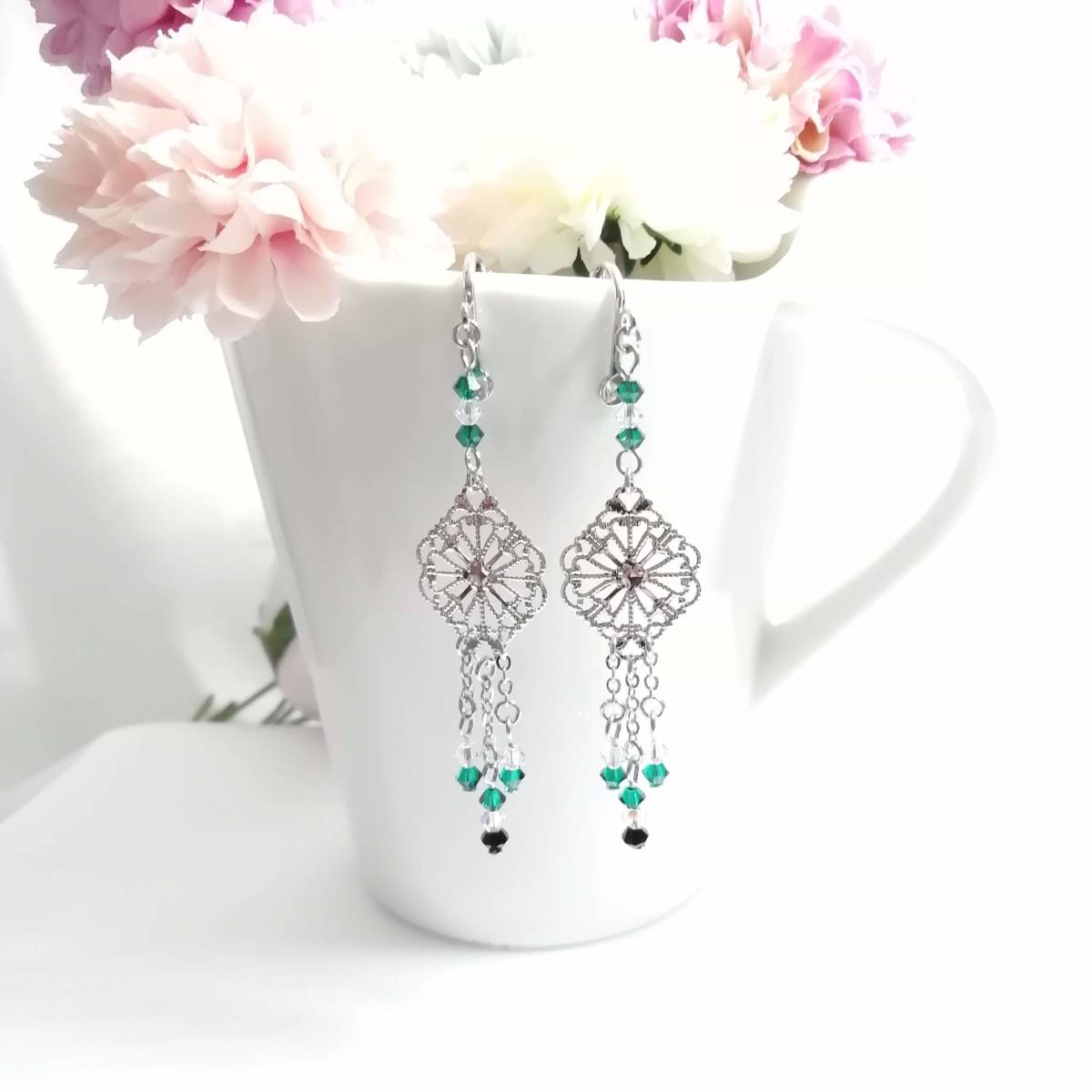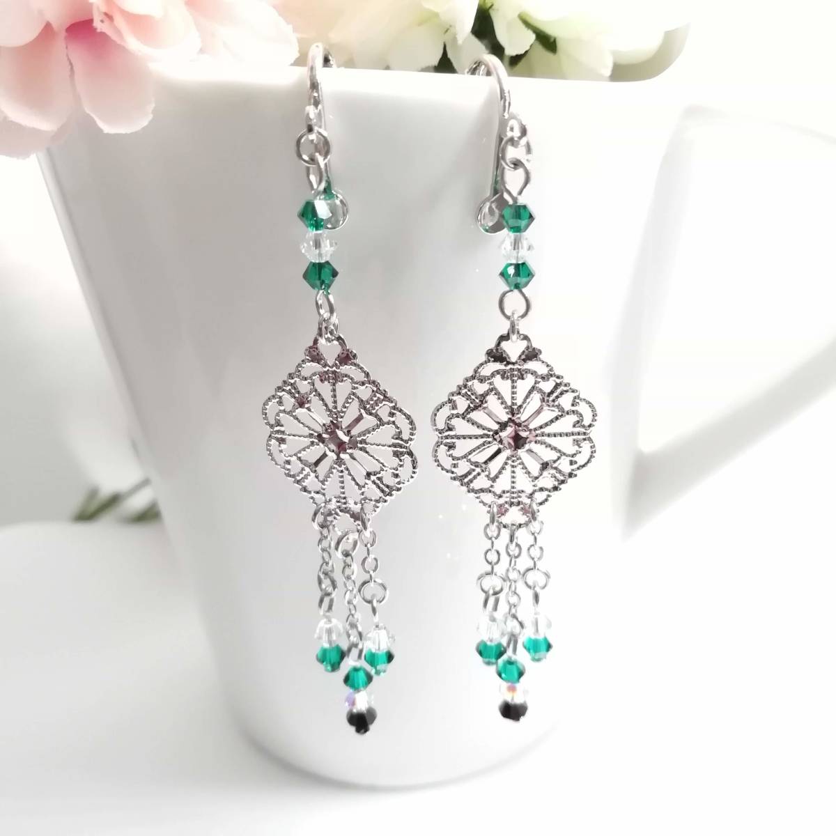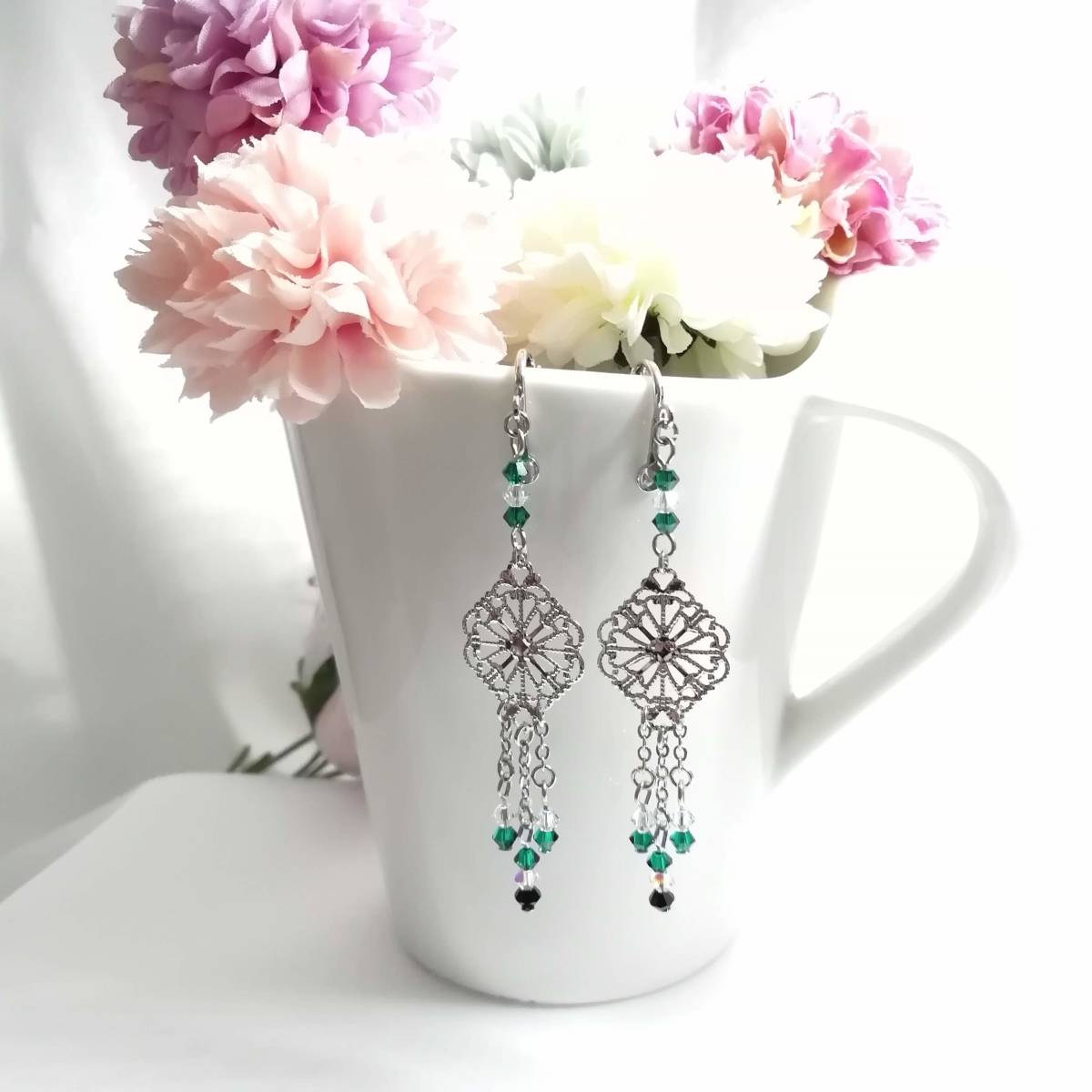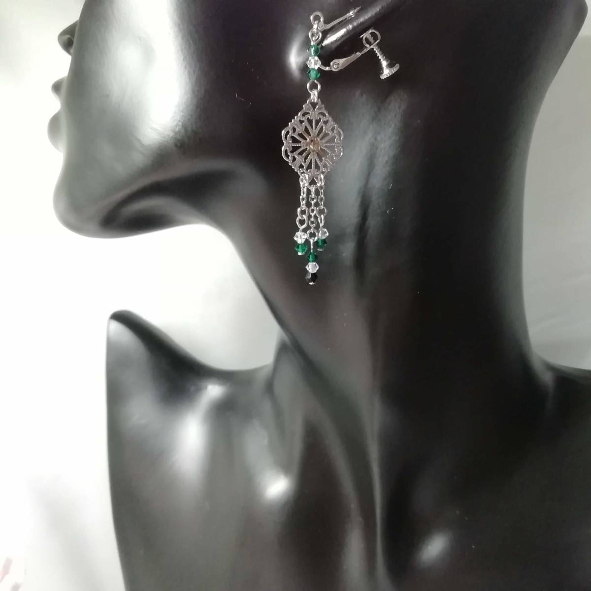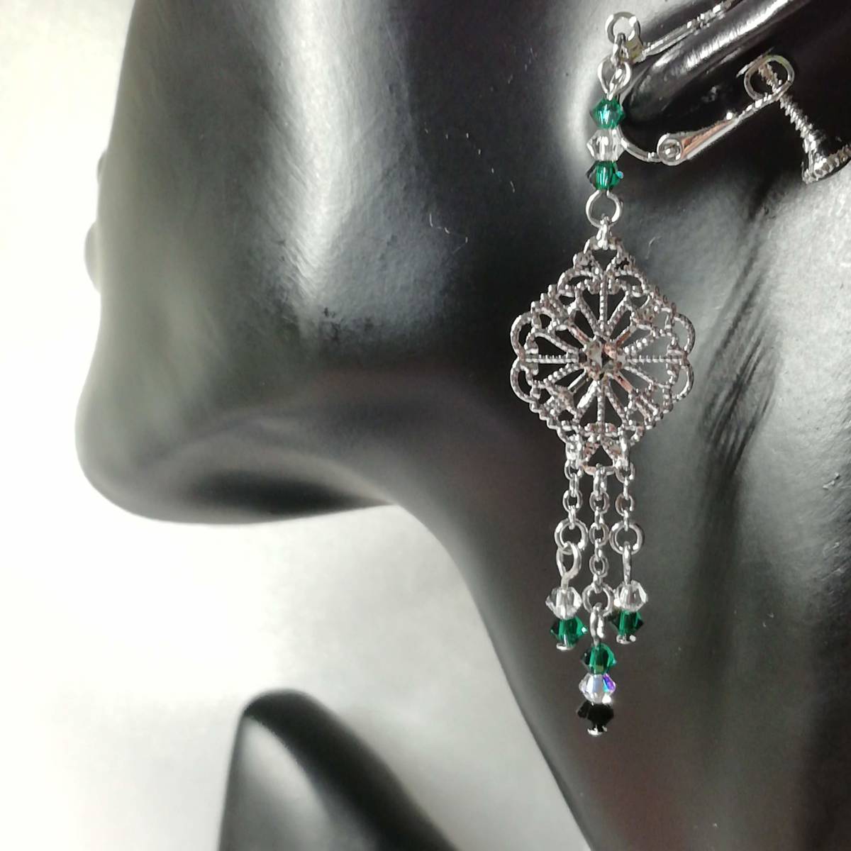 | ★商品内容★ ★レースパーツと緑と黒のハンドメイドイヤリング★シック・スワロフスキー・上品・ゴージャス・シルバー・エメラルド・グリーン・クリスタル・黒 シルバーのレースパーツと小粒のスワロフスキーとを組み合わせた シックでゴージャスなロングイヤリングです*・.**.☆・。**.・。☆*・**。・ 吊る下げたスワロフスキーの小粒ビーズが 光の反射でキラキラととても綺麗に煌きますます*・.**.☆・。**.・。☆*・**。・ 普段使いはもちろん、お出掛けや お洒落のワンポイントなどにも最適です・。**.☆・。*・**☆*。・. 【素材】 スワロフスキー5328エメラルド(オーストリア製)3mm スワロフスキー5328クリスタル(オーストリア製)3mm カットガラスビーズジェット3mm レースパーツロジウム15mmx22mm 小粒チェーンシルバー カンより垂れ下がる長さは、約6㎝です。 Eー564 ★商品状態★ ・画像と実物の色味が多少異なる場合があります。 ・緩衝材(プチプチ等)を使用し、防水梱包でお届け致します。 ★注意事項★ ***~ご購入前に必ずお読み下さい~*** ***商品について*** *一点一点心を込めて作っておりますが、手作りなため多少の歪み等あるかもしれません。 手作りの味わいと、世界で一つだけの作品とお考えいただければ幸いです。 *デリケートな商品ですので、強く引っ張ったりすると破損する事もあります。 お取り扱いにはご注意ください。 *写真も完璧な色合いの表現にはなっていない場合もあります。 *基本イヤリング金具は跳ね上げ式ネジ付きを使って作成しています。 ご希望によりピアスへの変更も承っております【フックピアスへの変更無料/キャッチピアスへ変更(別途追加料金120円が必要です)】 ~ご注文の際にメッセージ欄よりお申し付けください~ 尚、金具変更のご希望が無い場合は、掲載された写真の金具にてお送り致します。 *金属アレルギーや化学物質アレルギーなどへの対応はしておりませんので、ご心配な方はご遠慮下さいますようお願い致します。 *永くご愛用頂くために、ご使用後は柔らかい布等で軽く拭いてください。 ***ご質問について*** *ご購入前にお願い致します。 日中は仕事をしておりますので、ご返事が直ぐに出来ない場合がございます。 出来る限り早い対応を心がけますが、ご了承ください。 また、発送までには、お振込み確認後、翌日の発送を心がけておりますが、仕事の都合により2~3日程かかる場合がございます。(その際にはナビにてご連絡いたします) お急ぎの場合は、極力対応いたしますが、場合によっては対応致しかねる事もあります。ご了承下さいませ。 落札後4日以内にお手続き、ご連絡が無い場合は落札者都合で削除致します。 発送日指定・ご入金の予定が1週間以上先をお考えの方は、入札の前に質問よりご連絡くださいませ。 予めご了承の上、ノークレーム・ノーリターンでお願い致します。 | |||