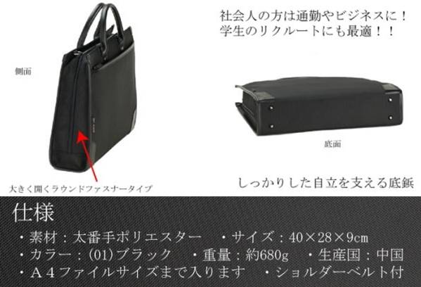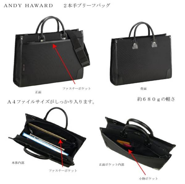 | ★ANDY HAWARD アンディハワード クラシカルで上品なスタイル 大開き仕様で出し入れもスムーズ リクルートや就活に ショルダーベルト付きでスマホ操作も楽々 2way A4F ◎クラシカルで上品なスタイリング 自立タイプで足元に立てておけます。 ◎サイドまで大きく開く3方大開きタイプ 中が見やすく出し入れもしやすい ◎A4ファイルサイズ対応。資料入りの大型封筒も 折らずに収納できます。 ◎ショルダーベルト付属。両手が空くので スマホの操作も楽に出来ます。 ◎軽くて丈夫な、お値打ち価格のビジネスバッグ。 ◎リクルートや就活にも活用できます。 【バッグインフォメーション】 ●サイズ:横幅40×高さ38×厚み9センチ ●素材:ポリエステル(1680デニール糸使用) ●カラー:(01)クロ ●本体正面:ファスナーポケット ●本体内部:ファスナーポケット ●ショルダーベルト付き ●重量:約680g ●生産国:中国(企画:日本) ●A4ファイルサイズが入ります ※ 予告なく仕様変更する事がありますのでご了承下さい。 この商品を購入された方のコメント ・考えていた以上に軽くて、驚きました。まだ、使用していないので、耐久性は未知数ですが、しっかりした作りだと思います。収納は、自分の用途には十分です。これから使っていきたいと思います。 ・品質はとてもよくてオススメします。スタッフも親切に対応してくれています、ありがとうございます。とても楽しい買い物でした。 ・就活用カバンとして購入しました。 ベーシックなデザインで良いと思います。 ・思ったより軽く、丈夫そうで良かったです。 ・とっても軽くてしっかりした作りの鞄に、旦那も満足しておりました。 お店の対応も、商品もとっても良かったので、大満足です! ・写真で見るより高級感がありました。 子供が使うのですが とても気に入ってました。 ・息子の就活用に購入しました。 少し重い気がしますが、息子は喜んでいます。 | |