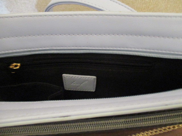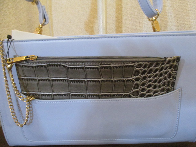 | 商品紹介 | 水色の合皮素材のベースに濃いグレーのヘビ柄型押しのポーチを正面のポケットに入れたデザインが可愛いです。 ポーチはチェーンで繋がっていますが、取り外しも可能です A4が入るぐらいのサイズです 肩掛けも可能で、ショルダー紐を伸ばして斜めがけもできます(ショルダー紐取り外し可能) 内側は 黒の コットン系素材です 入り口は チャック式になります。 外ポケット 正面ポーチ入れ1、 裏側 2つ折り財布サイズ1(チャック式) 内ポケット 2つ折り財布サイズ1(チャック式) 携帯サイズ1パスケースサイズ1(いずれもチャック等なし) |