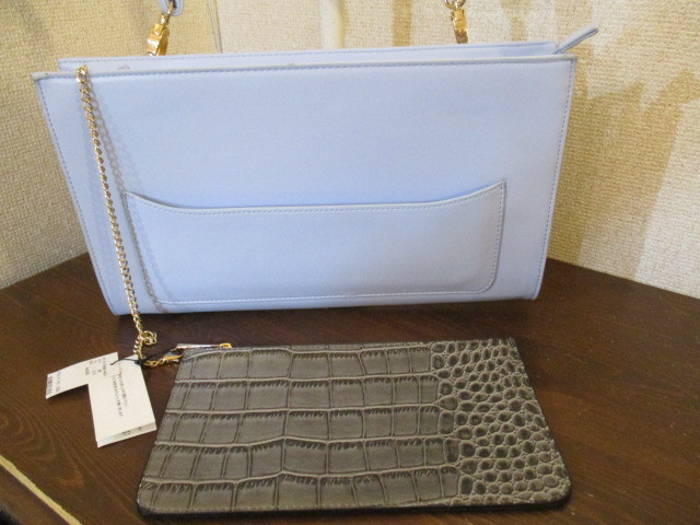 | 商品紹介 | 水色の合皮素材のベースに濃いグレーのヘビ柄型押しのポーチを正面のポケットに入れたデザインが可愛いです。 ポーチはチェーンで繋がっていますが、取り外しも可能です A4が入るぐらいのサイズです 肩掛けも可能で、ショルダー紐を伸ばして斜めがけもできます(ショルダー紐取り外し可能) 内側は 黒の コットン系素材です 入り口は チャック式になります。 外ポケット 正面ポーチ入れ1、 裏側 2つ折り財布サイズ1(チャック式) 内ポケット 2つ折り財布サイズ1(チャック式) 携帯サイズ1パスケースサイズ1(いずれもチャック等なし) |