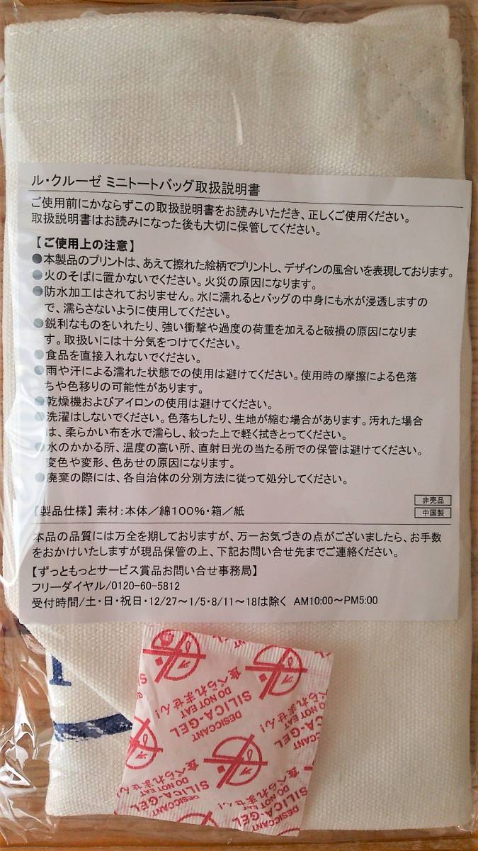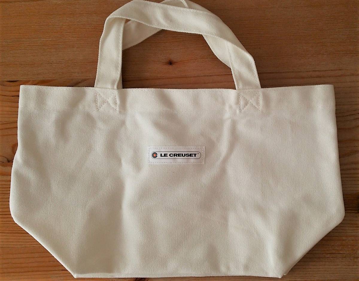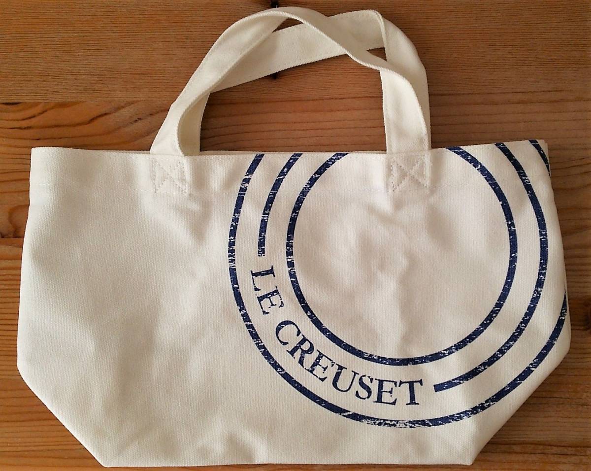 非売品 ル・クルーゼ ミニ トートバッグ 綿100% 白×青 縦20㎝×横最大35㎝×まち14㎝ かばん