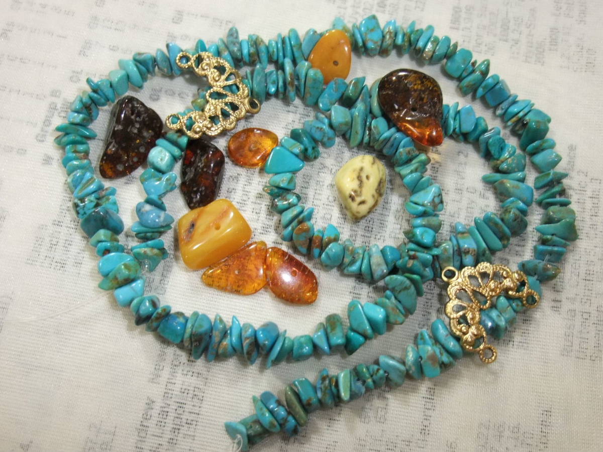 お色綺麗♪本ターコイズ本トルコ石アメリカ産と本琥珀ルースとアンティークビンテージデザインの真鍮パーツセット♪本琥珀の平タンブルなフリーシェイプのルースは一番人気のハニカム色も必ず一つは入ったお得なセットです♪ターコイズはなかなか高品質な小粒の薄平さざれ系の本ターコイズ連材で、人気のアメリカ産の約40cm1本です☆このお値段なら初心者の方でも気軽に本物で製作できる、リーズナブルで安価なお薦めセットです☆